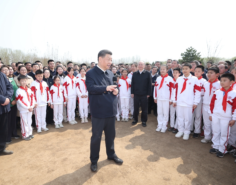 挥锹铲土、培土围堰、提水浇灌……习近平接连种下油松、黄栌、元宝枫、樱桃、红叶碧桃、侧柏等多棵树苗。习近平一边植树,一边询问孩子们的学习生活、劳动锻炼情况。他强调,广大青少年是祖国的未来,从小要积极参加劳动、植树造林,把绿色的种子种进心里,养成尊重自然、热爱自然的意识,勤奋学习、锻炼身体、茁壮成长,德智体美劳全面发展,努力成为国家栋梁。植树现场一派热火朝天的劳动景象,领导同志们同大家一起培土浇水,气氛热烈。