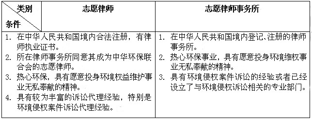 审核合格的志愿律师、志愿律师事务所代表(一名)须参加第十二期环境法律培训班并签署合作协议,正式成为中华环保联合会环境法律服务志愿律师(所)并获得证书或牌匾后,方可参与中华环保联合会环境诉讼等法律服务工作。