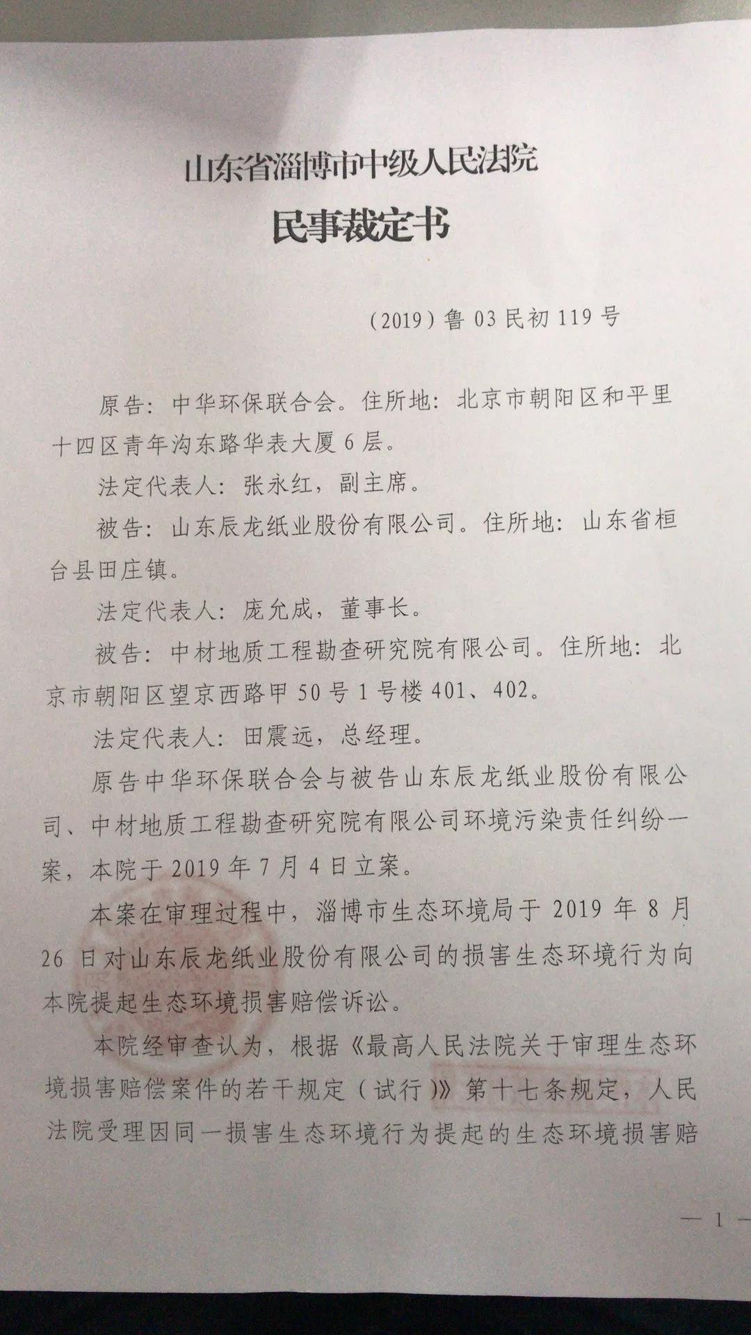 近日,我会收到淄博市中院出具的民事裁定书,以淄博市生态环境局已对博汇集团、辰龙纸业分别提起了生态环境损害赔偿诉讼为由,裁定我会上述两起公益诉讼案件中止诉讼。