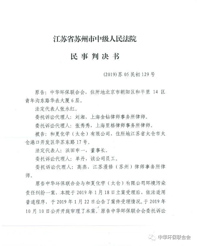 中华环保联合会诉和夏化学(太仓)环境公益诉讼案一审判决