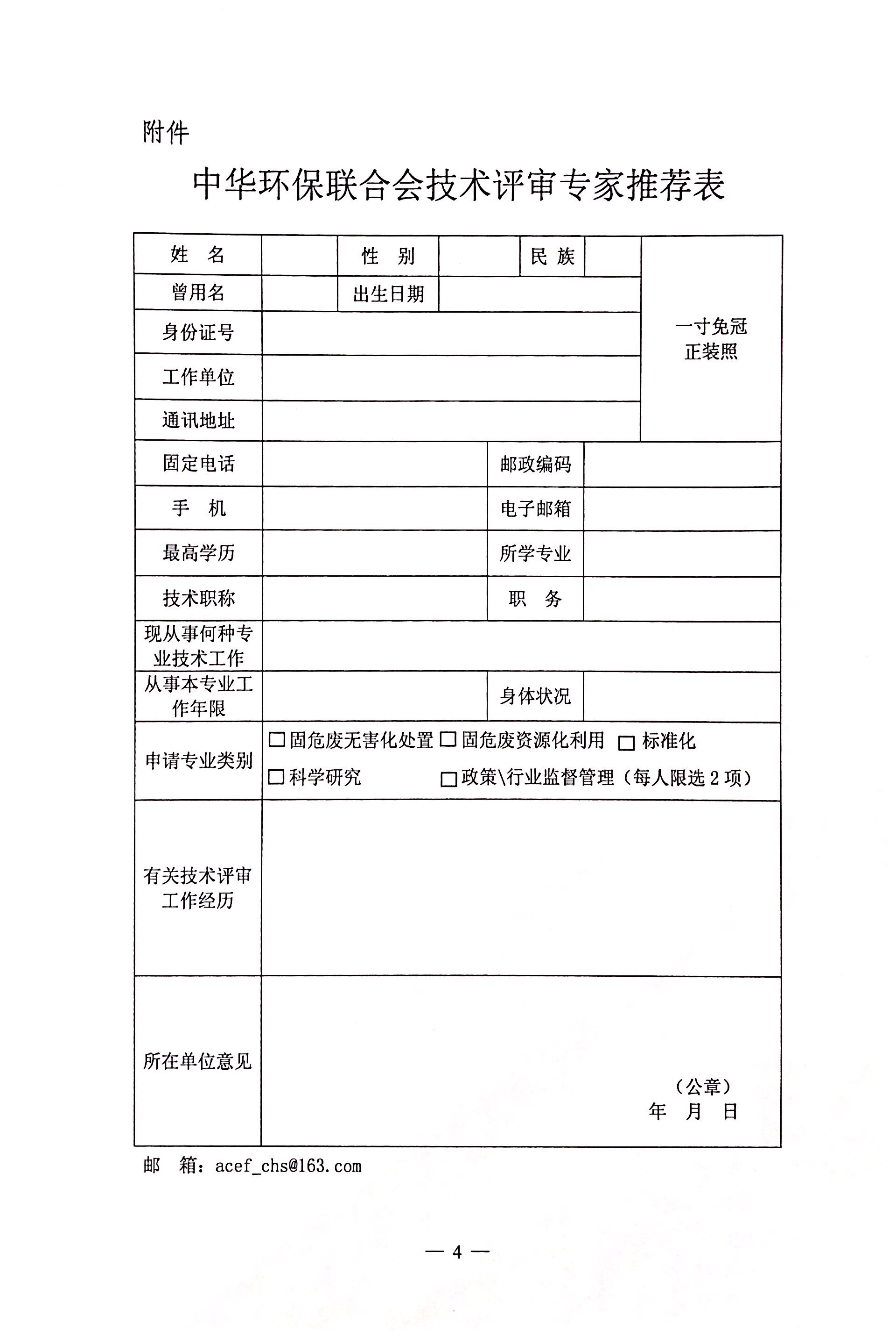 《中华环保联合会技术评审专家推荐表》