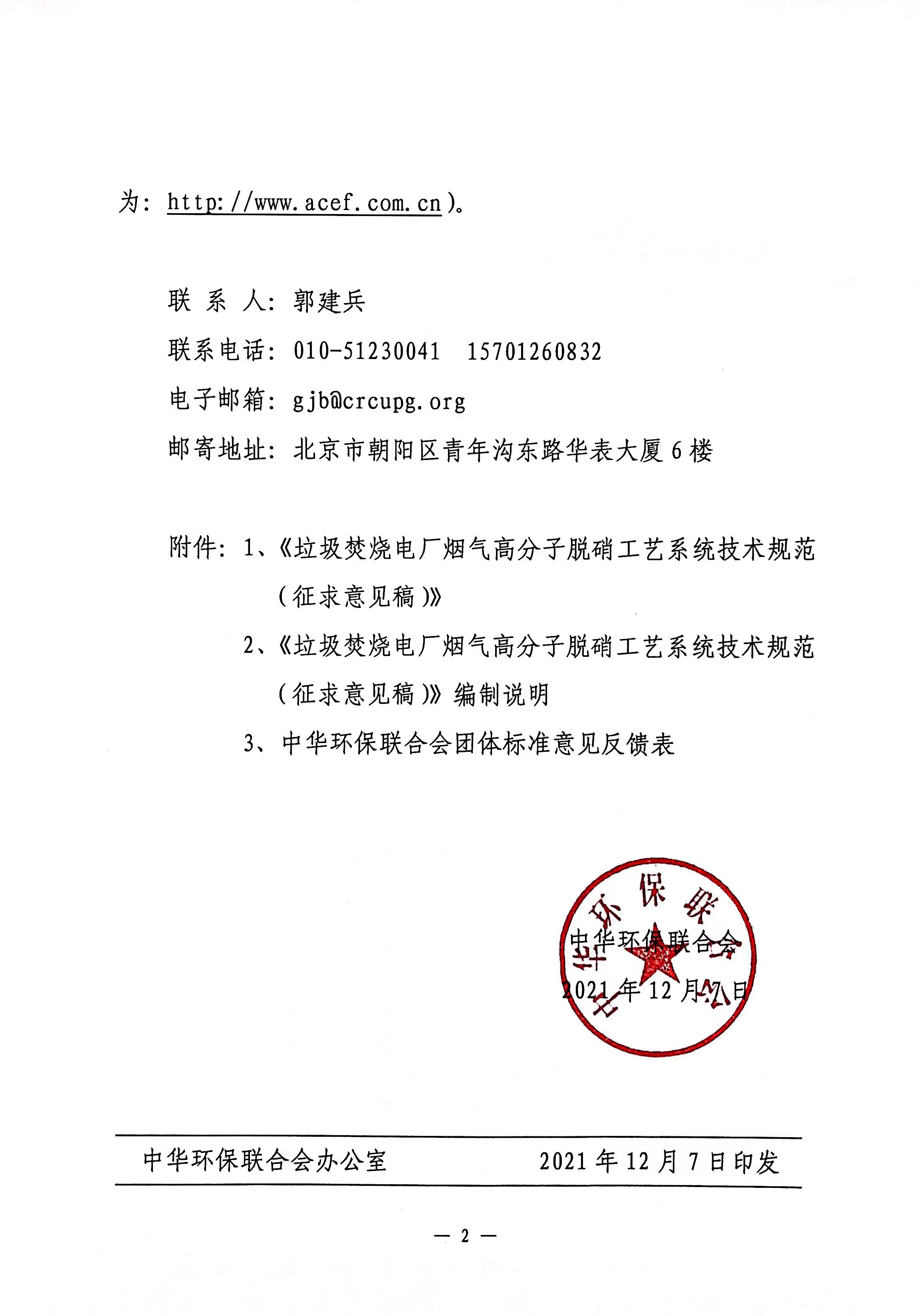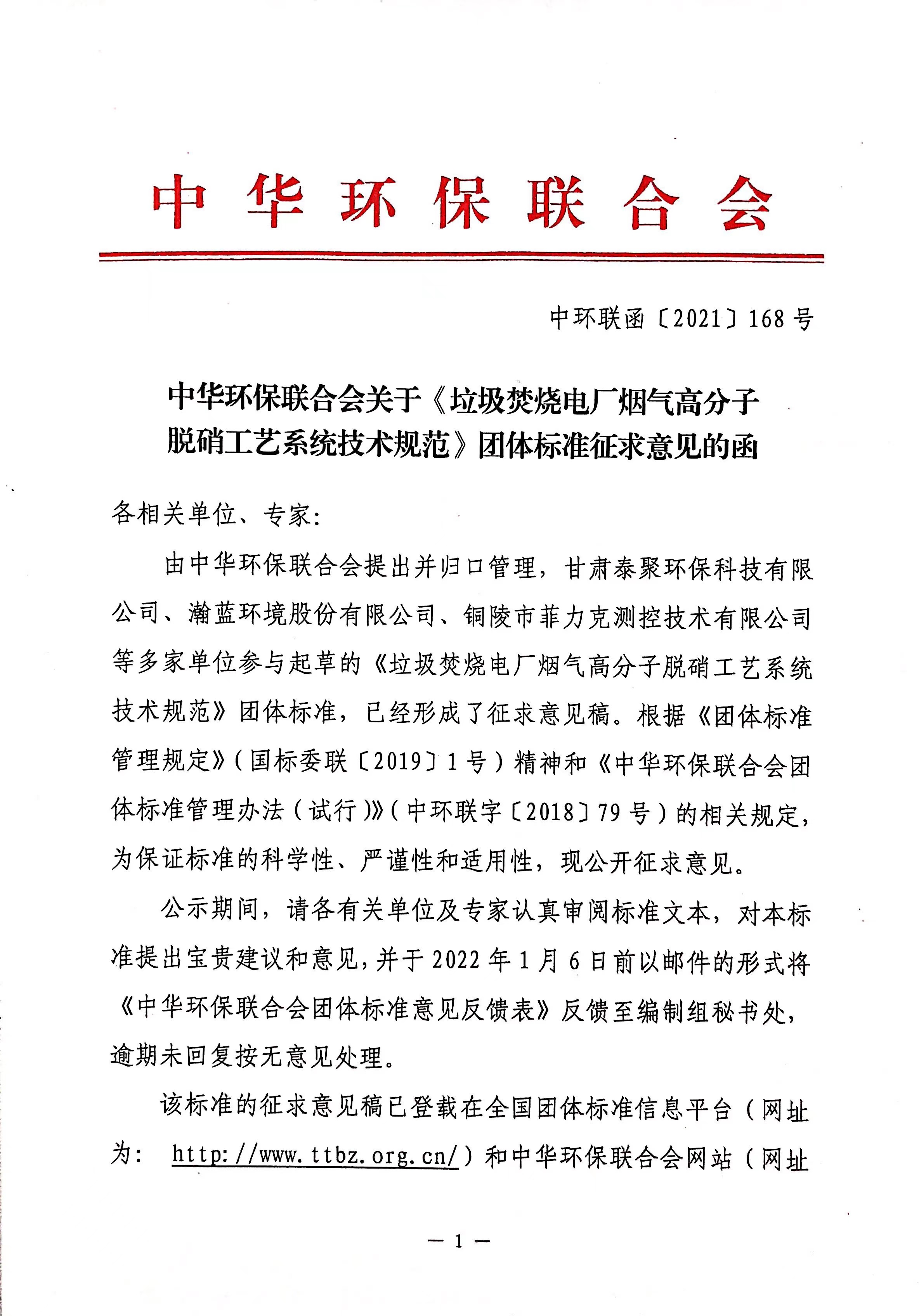 关于《垃圾焚烧电厂烟气高分子脱硝工艺系统技术规范》团体标准征求意见的函