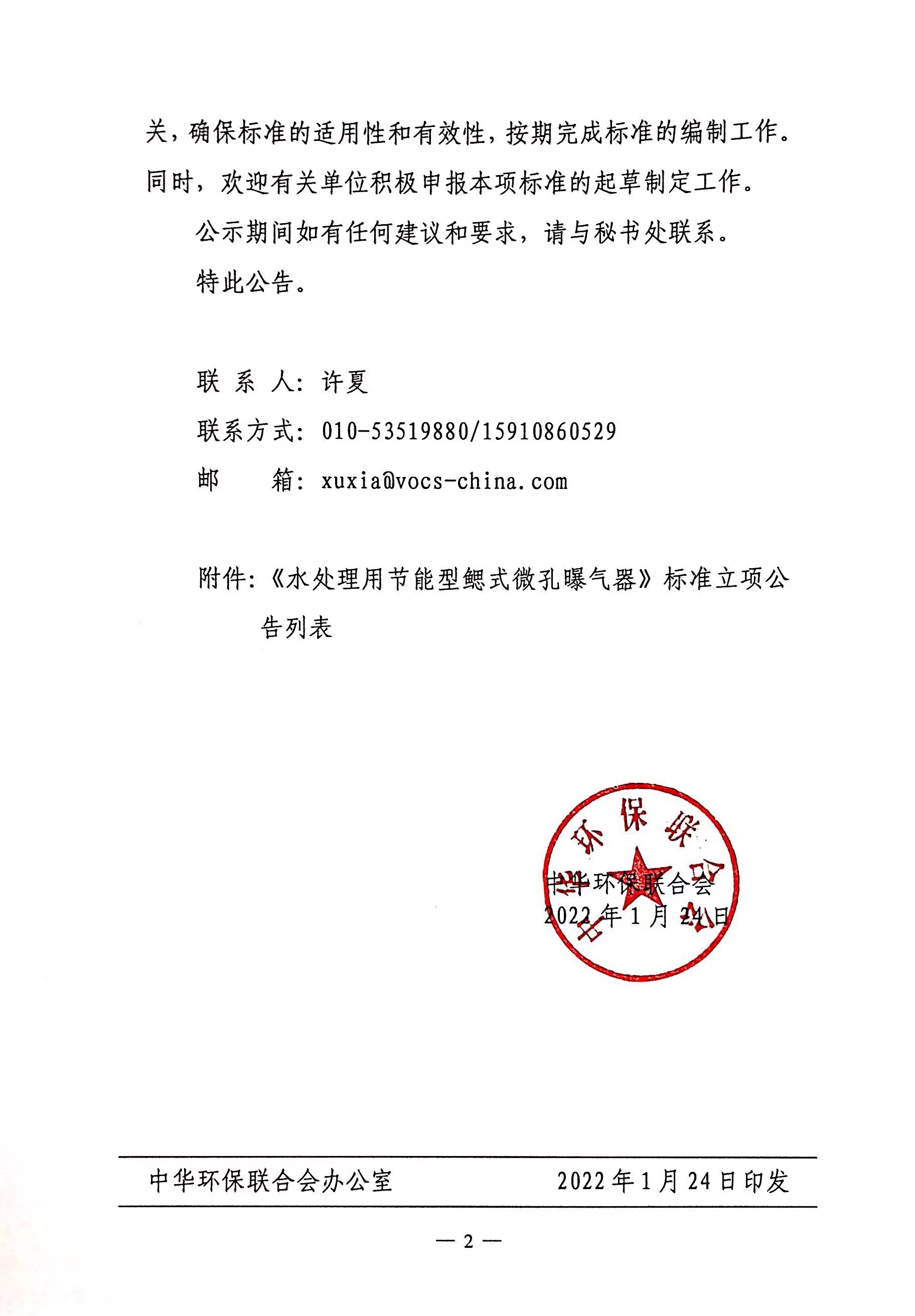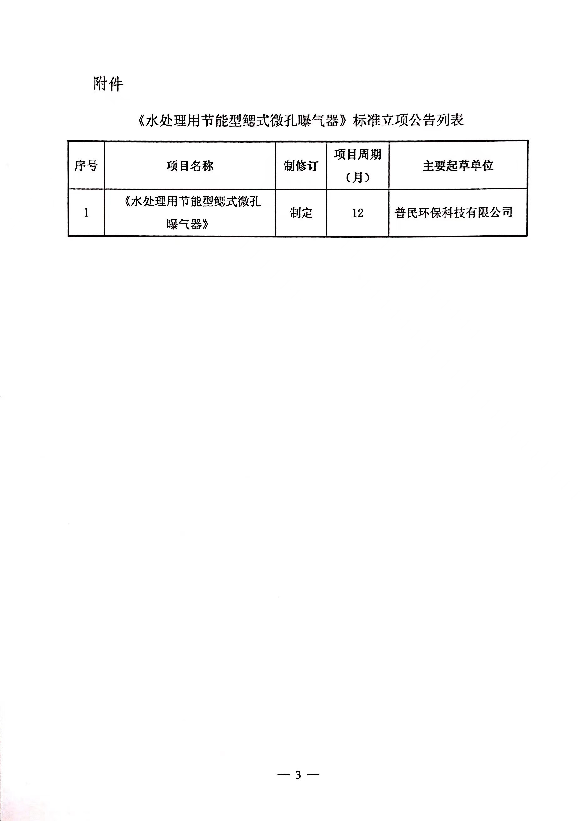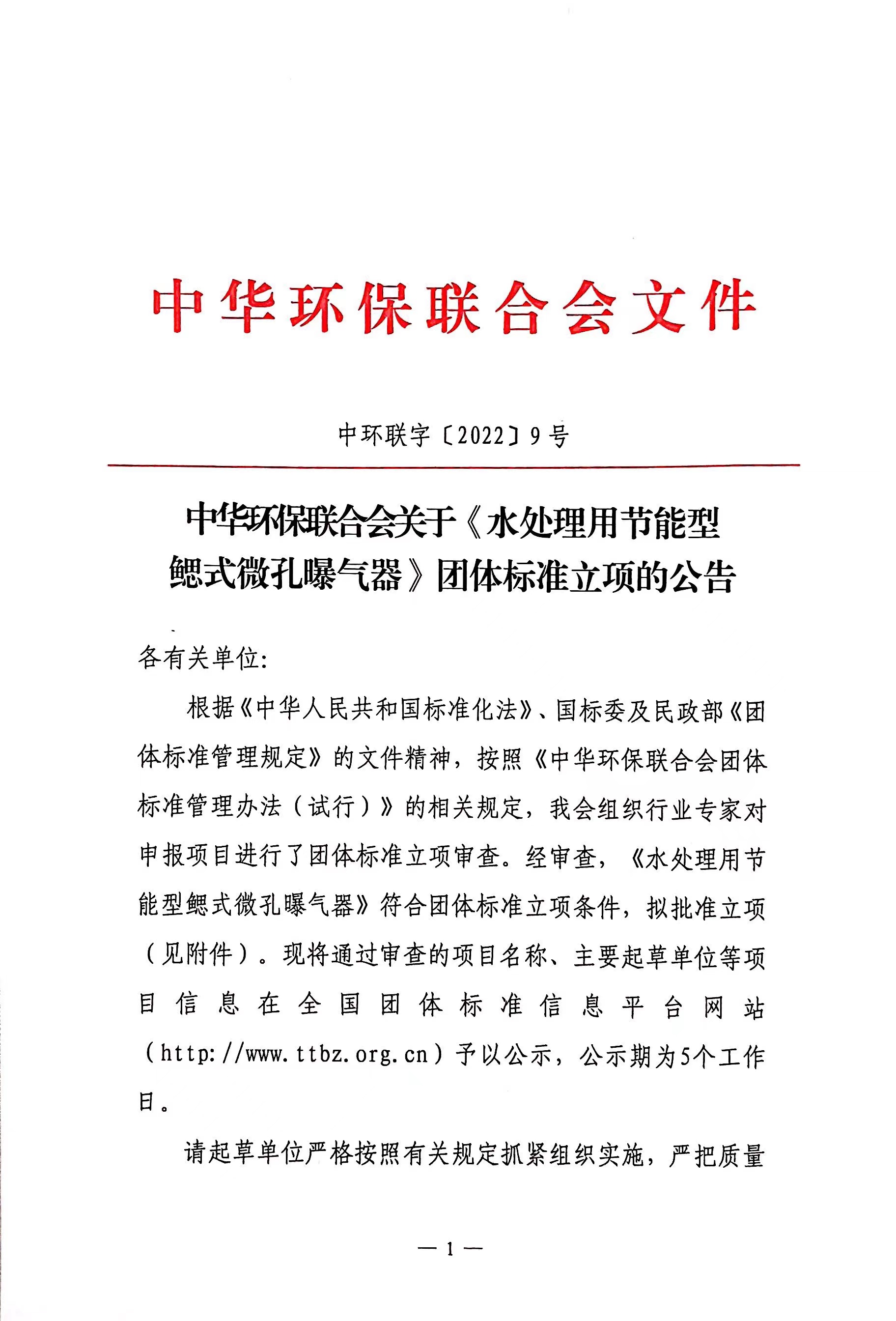 中华环保联合会关于《水处理用节能型鳃式微孔曝气器》团体标准 立项的公告
