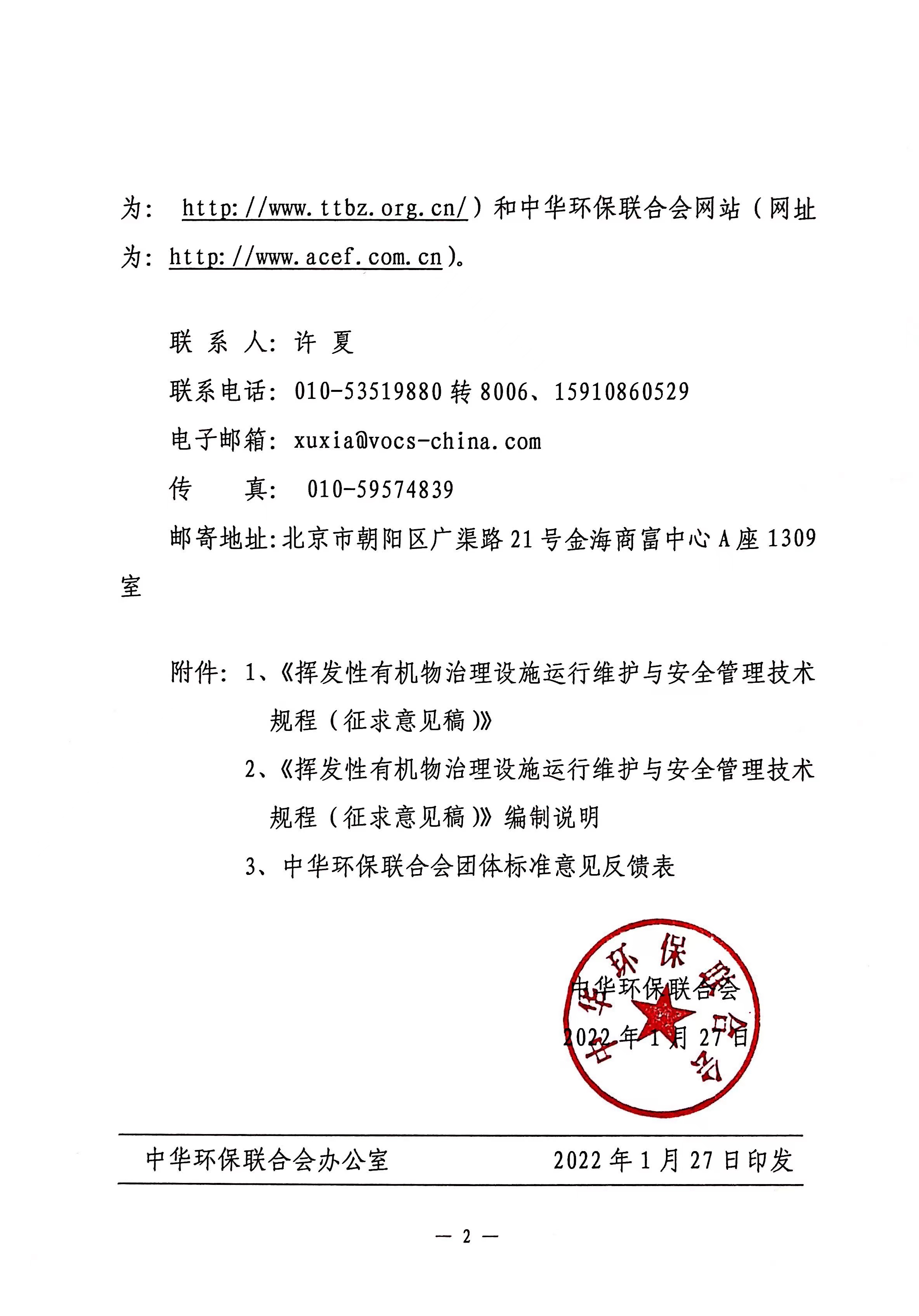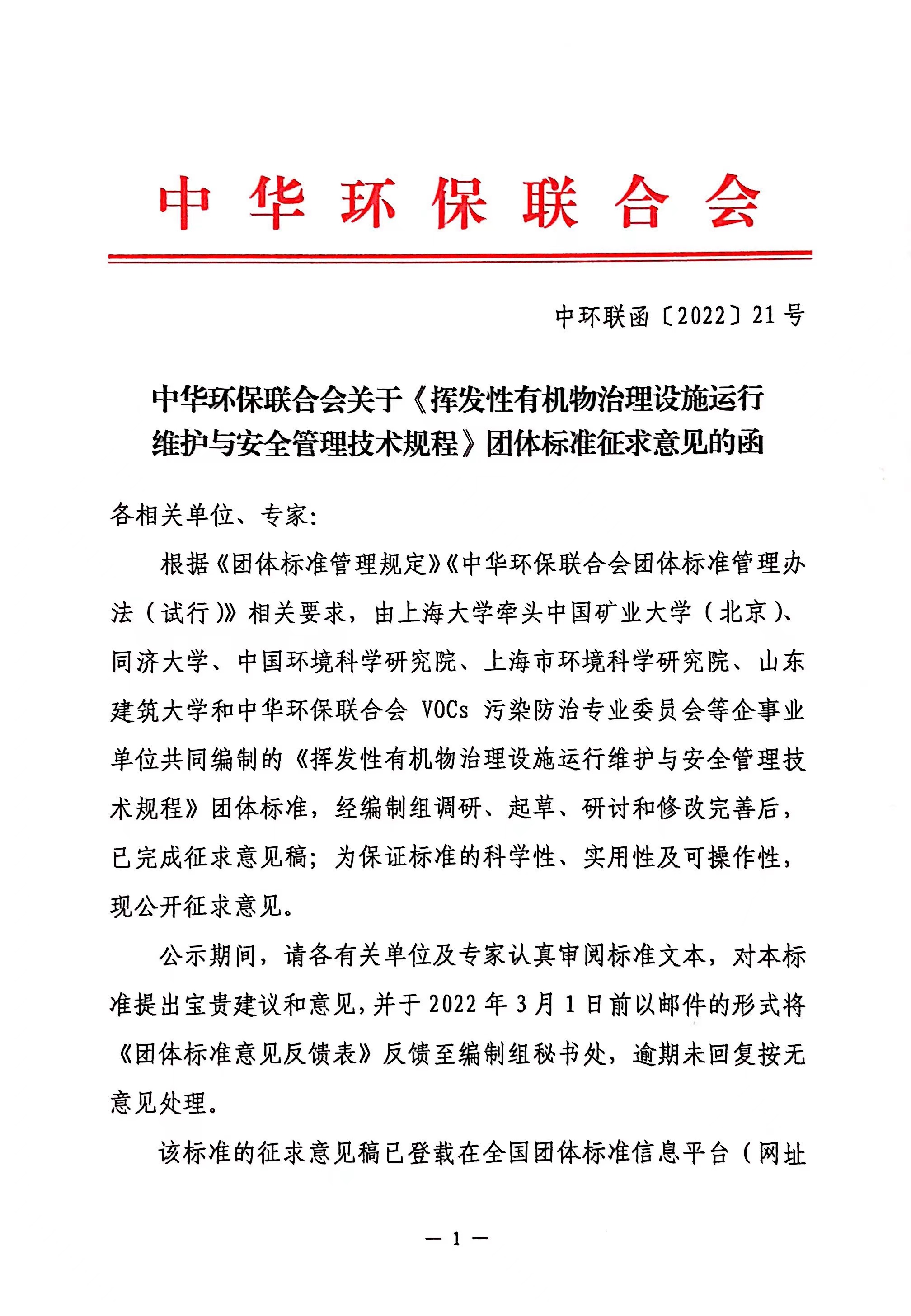 关于《挥发性有机物治理设施运行维护与安全管理技术规程》团体标准征求意见的函