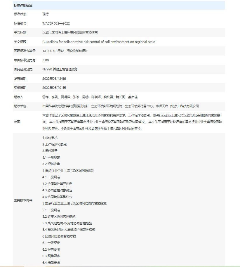 根据《中华人民共和国标准化法》以及国家标准化管理委员会、民政部联合制定的《团体标准管理规定》,依据全国团体标准信息平台和《中华环保联合会团体标准管理办法(试行)》,全国团体标准《区域尺度地块土壤环境风险协同管控指南》(T/ACEF 032-2022)经中华环保联合会批准于2022年5月24日正式发布,自2022年6月1日起实施。标准全文已于2022年6月5日第50个世界环境日在全国团体标准信息平台进行公布。