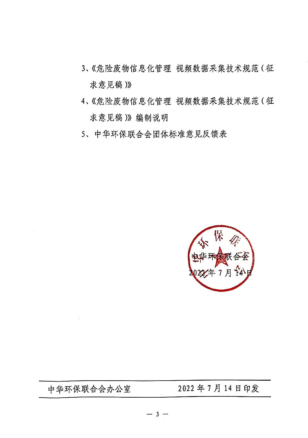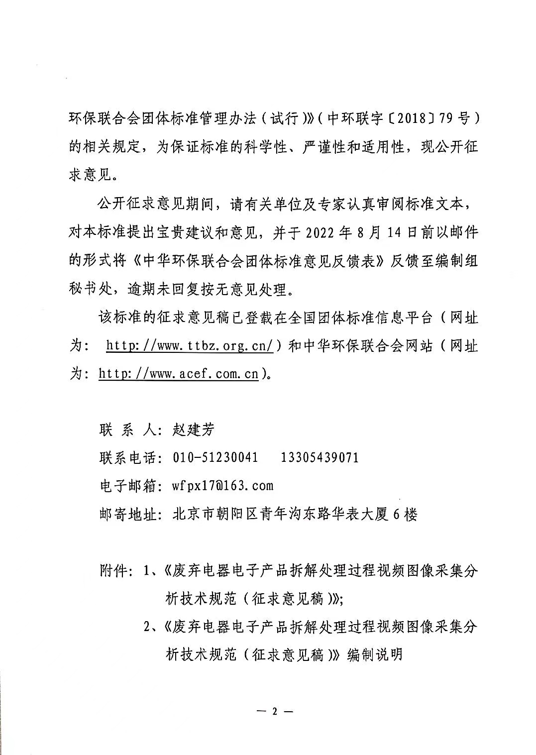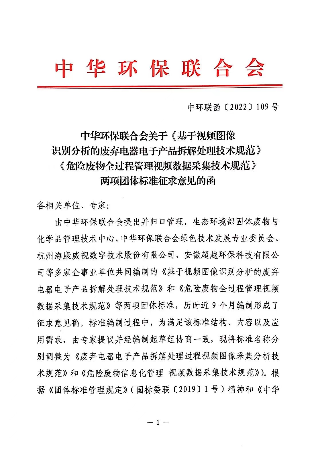 中华环保联合会关于《基于视频图像识别分析的废弃电器电子产品拆解处理技术规范》《危险废物全过程管理视频数据采集技术规范》两项团体标准征求意见的函