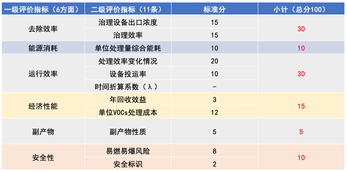 翻开《指南》,可以发现内容编制处处体现出张新民所说的“从更全面的角度量化体现技术用在企业主体上是否合适”这一宗旨,如设立包含去除效率、能源消耗、运行效率、经济性能、副产物、安全性在内的六项一级评价指标,以及出口浓度、综合能耗、副产物性质等11项二级评价指标。