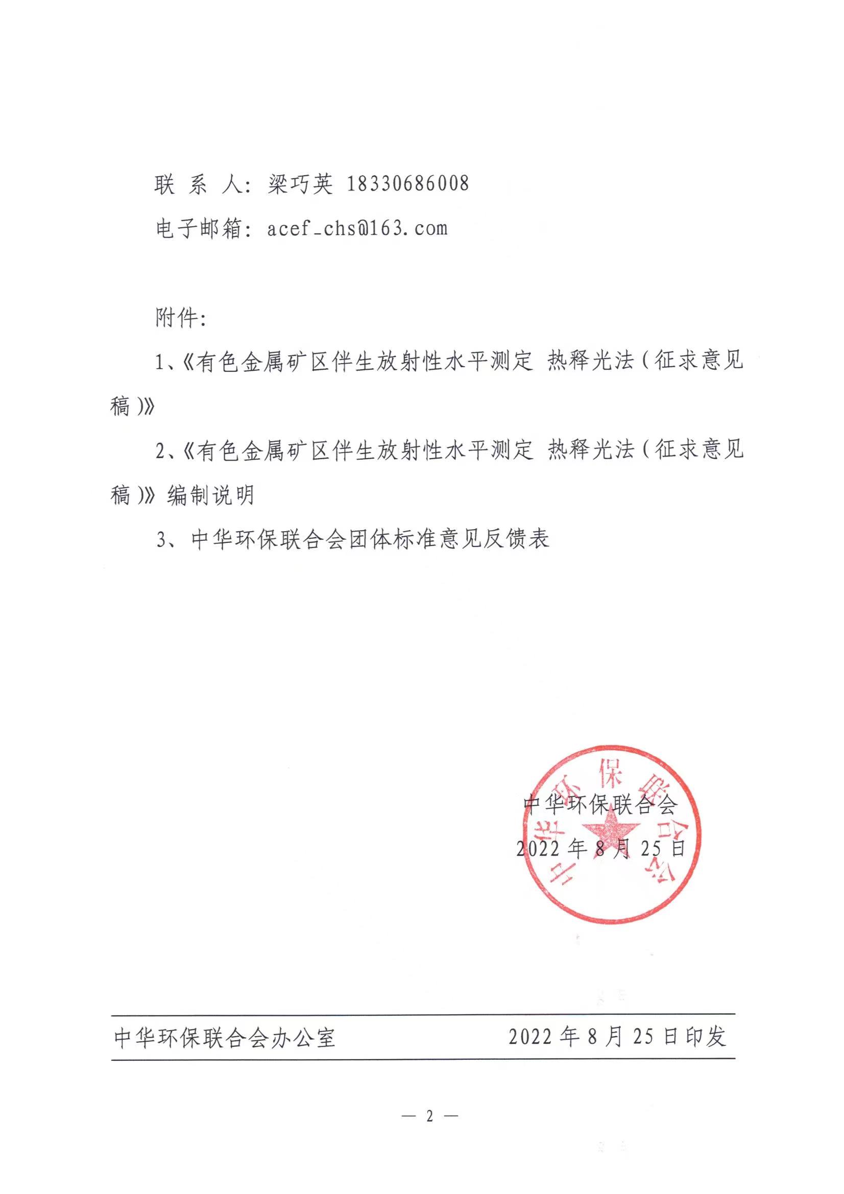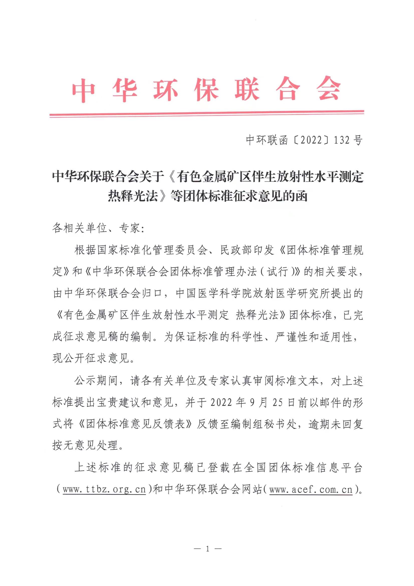 关于《有色金属矿区伴生放射性水平测定 热释光法》团体标准征求意见的函