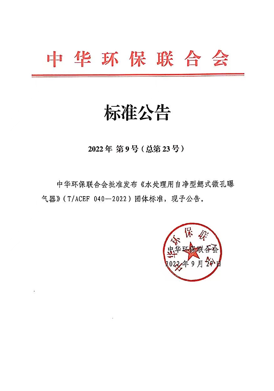 2022年9月27日,由普民环保科技有限公司牵头起草的《水处理用自净型鳃式微孔曝气器》团体标准由中华环保联合会在全国团体标准信息平台正式发布,自2022年9月27日开始实施。批准发布公告和标注文本已在全国团标标准信息平台进行发布。此项标准的发布有效填补了国内水处理用自净型鳃示微孔曝气器产品标准的空白。