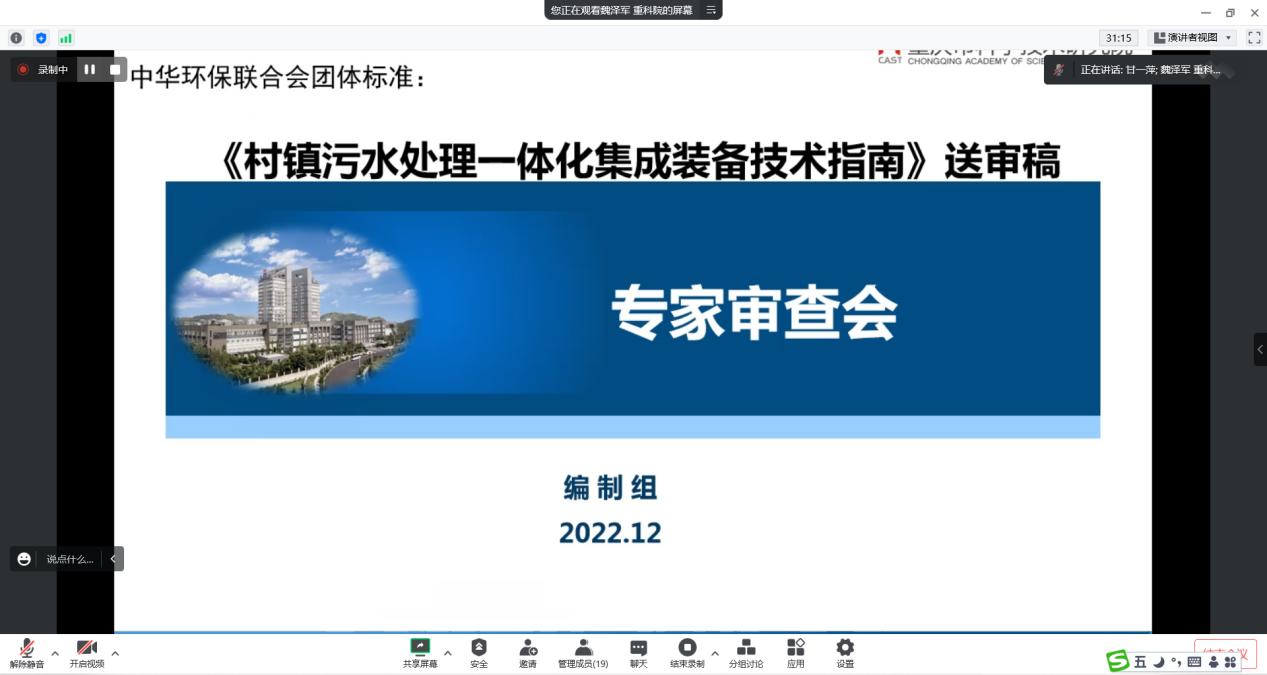 12月17日,中华环保联合会水环境治理专业委员会组织召开《村镇污水处理一体化集成装备技术指南》、《燃煤锅炉脱硫废水烟气余热浓缩干燥技术指南》、《污泥高温间接干化冷凝废水处理工程技术规程》送审稿审查会(线上视频会议)顺利召开。