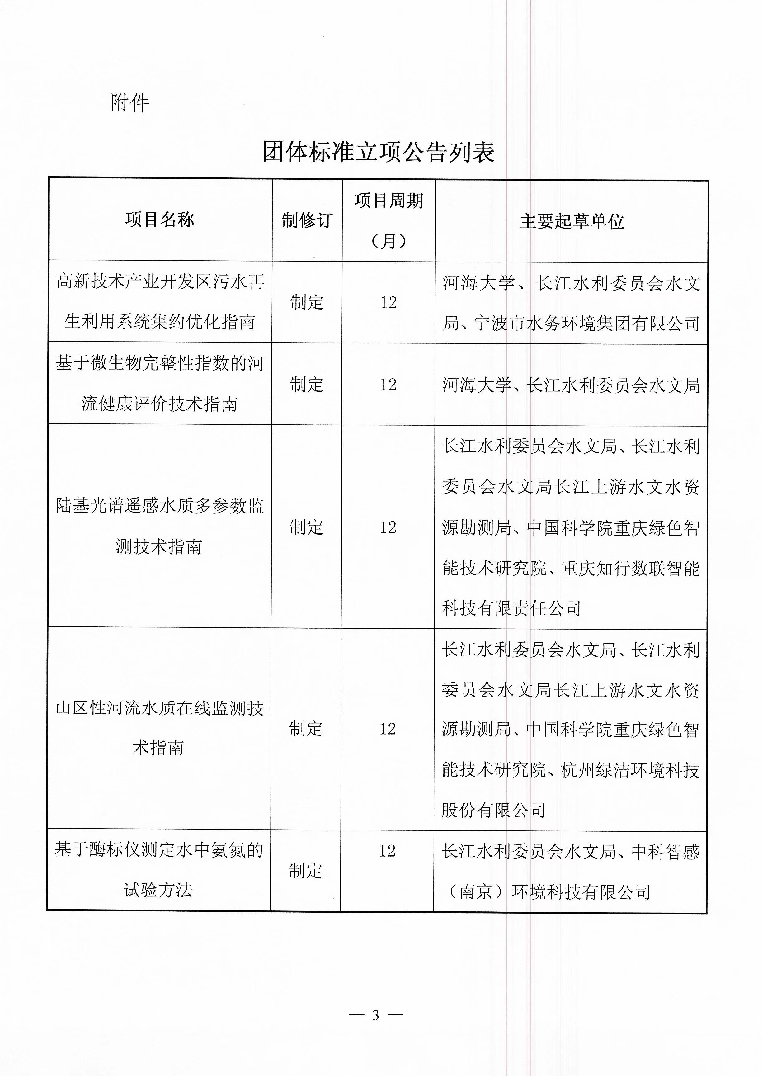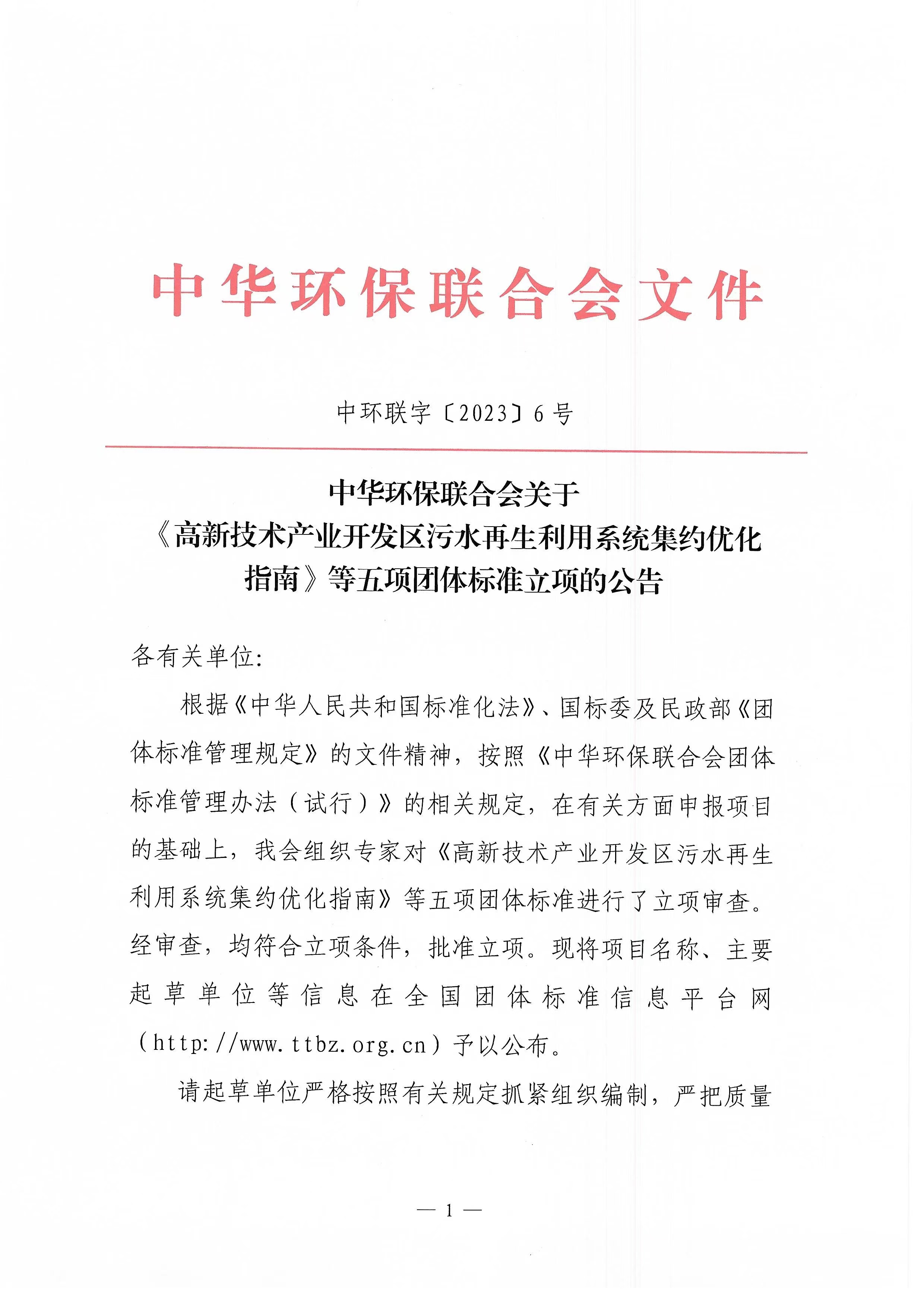 中华环保联合会关于《高新技术产业开发区污水再生利用系统集约优化指南》等五项团体标准立项的公告