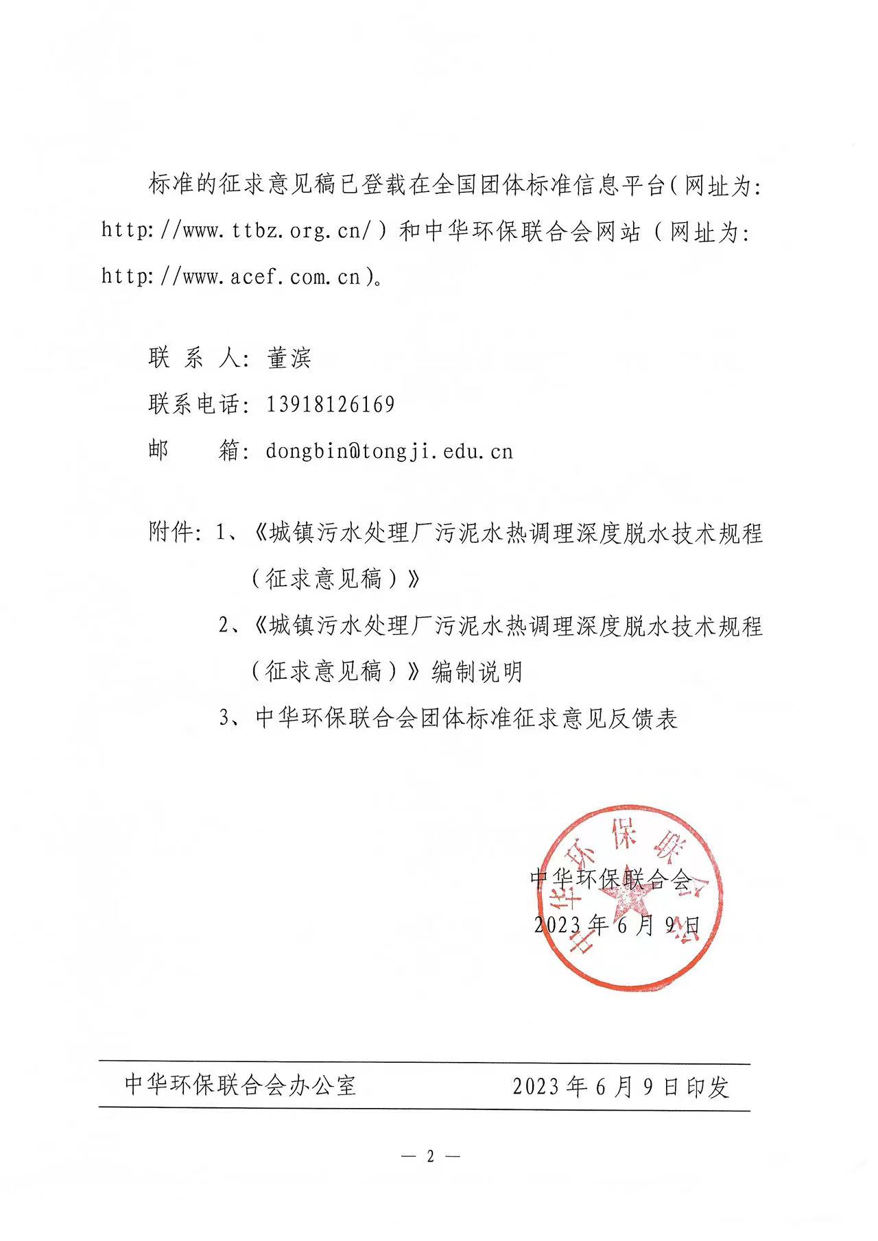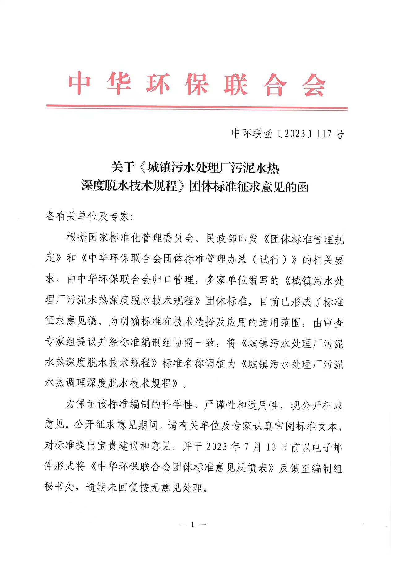 关于《城镇污水处理厂污泥水热深度脱水技术规程》团体标准征求意见的函
