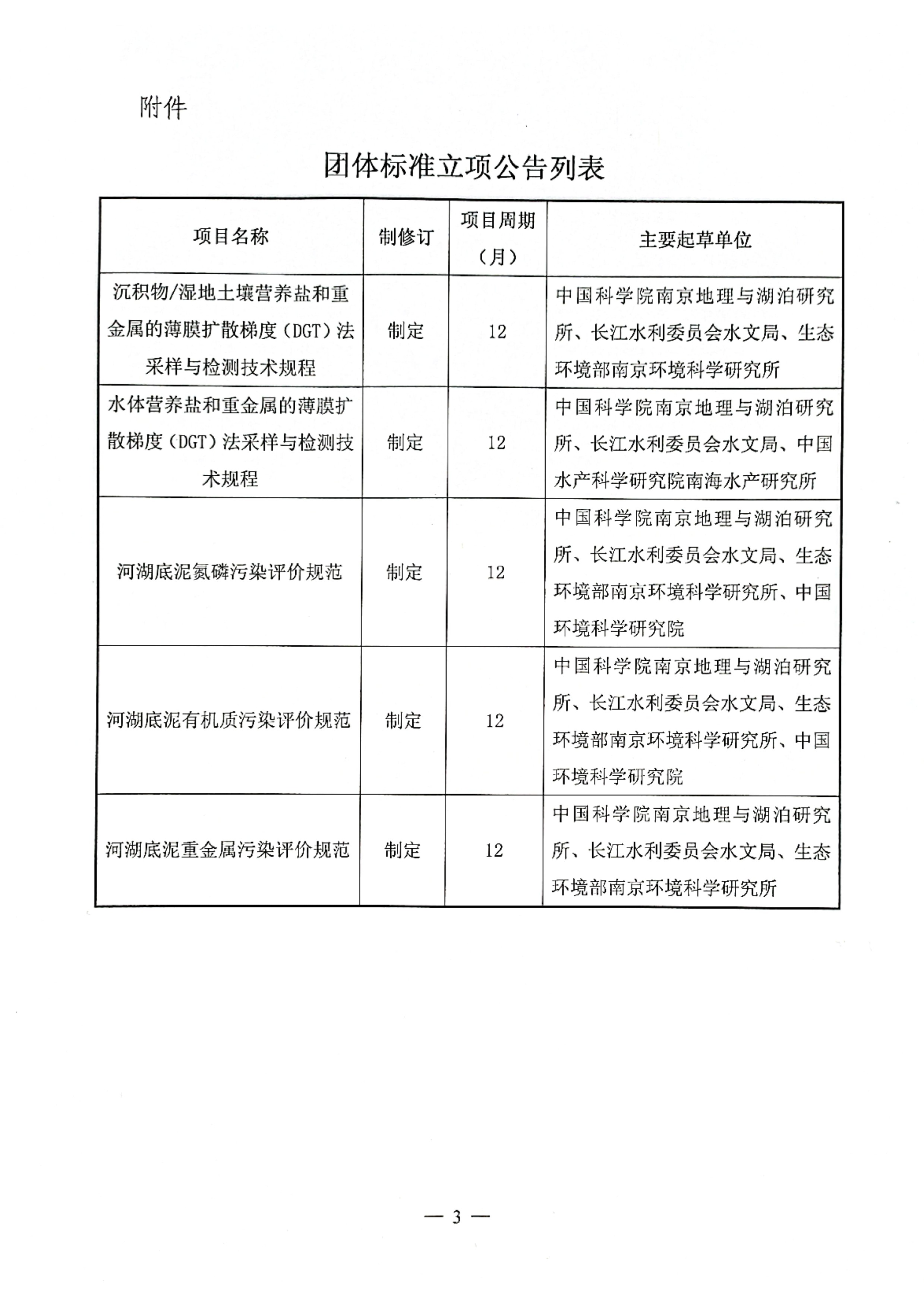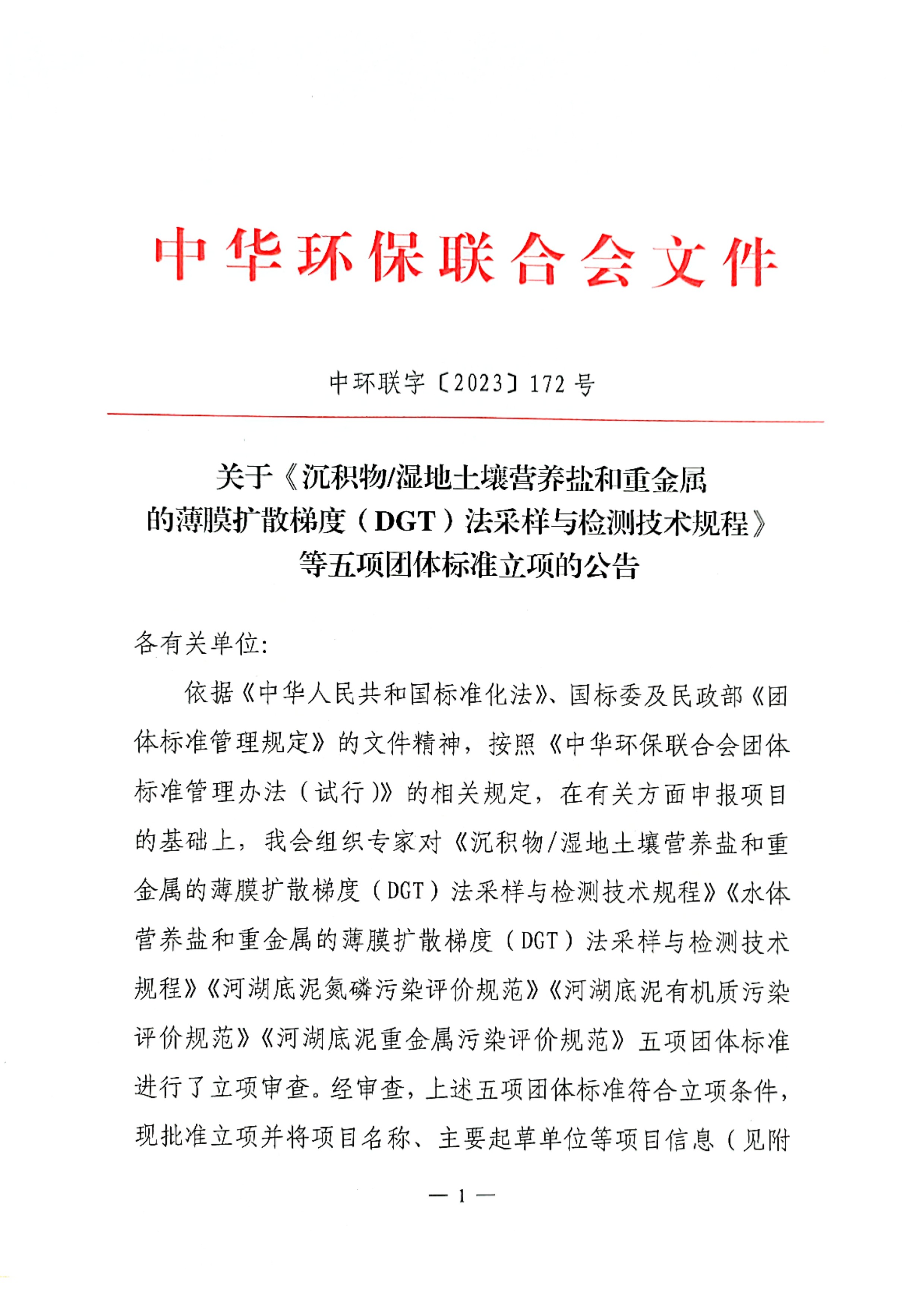 关于《沉积物/湿地土壤营养盐和重金属的薄膜扩散梯度(DGT)法采样与检测技术规程》 等五项团体标准立项的公告