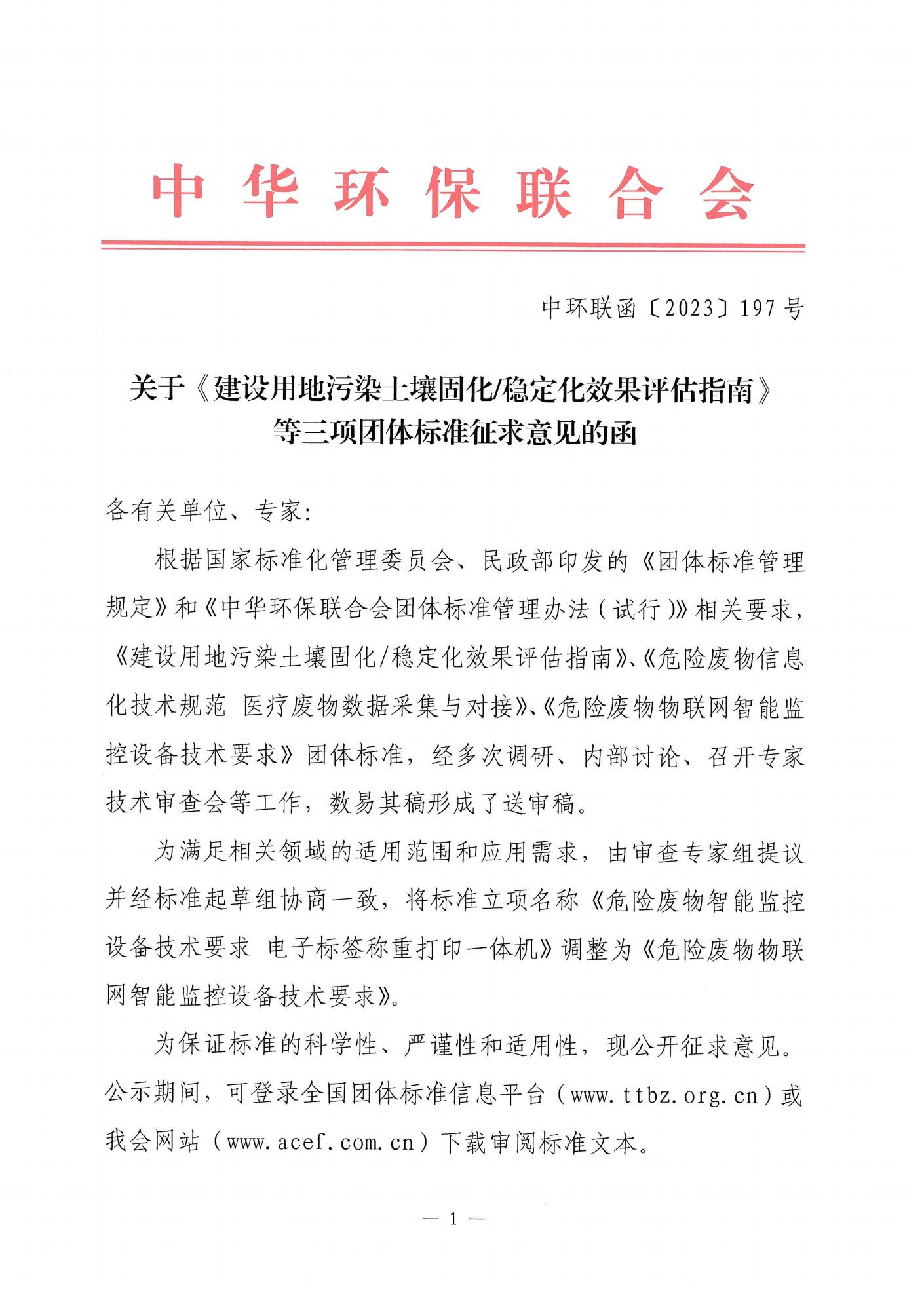 关于《建设用地污染土壤固化/稳定化效果评估指南》等三项团体标准征求意见的函