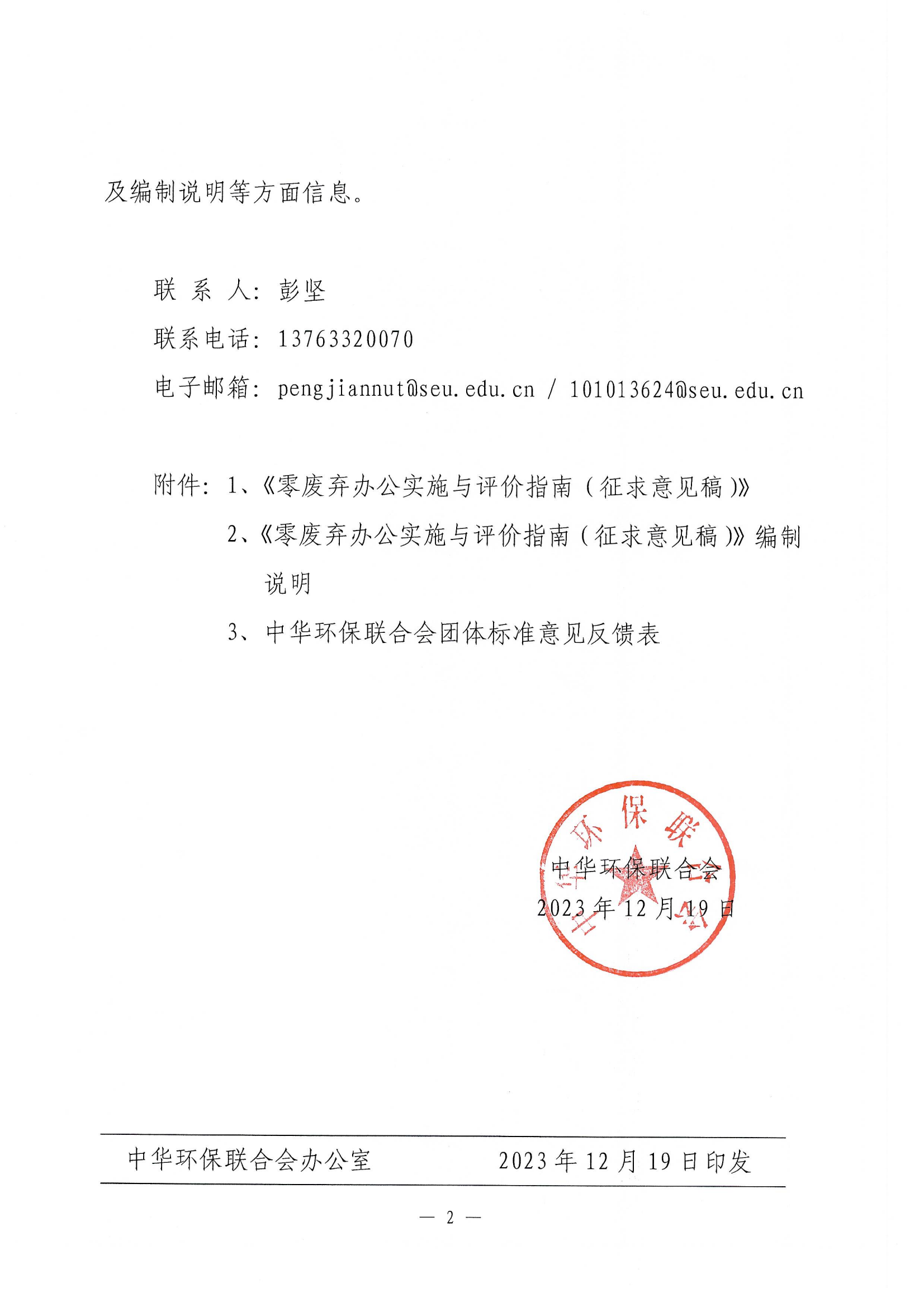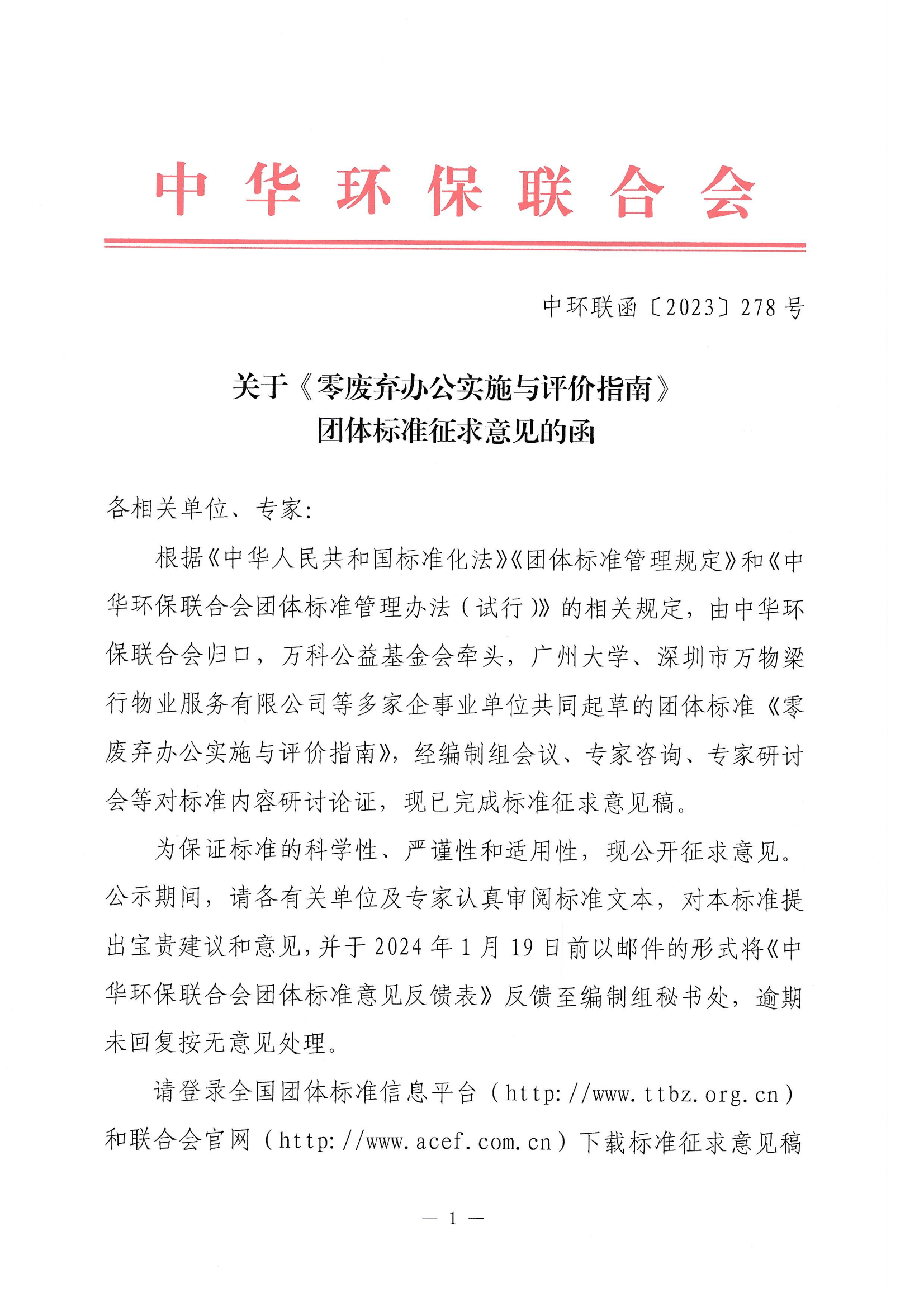 关于《零废弃办公实施与评价指南(征求意见稿)》团体标准征求意见的函