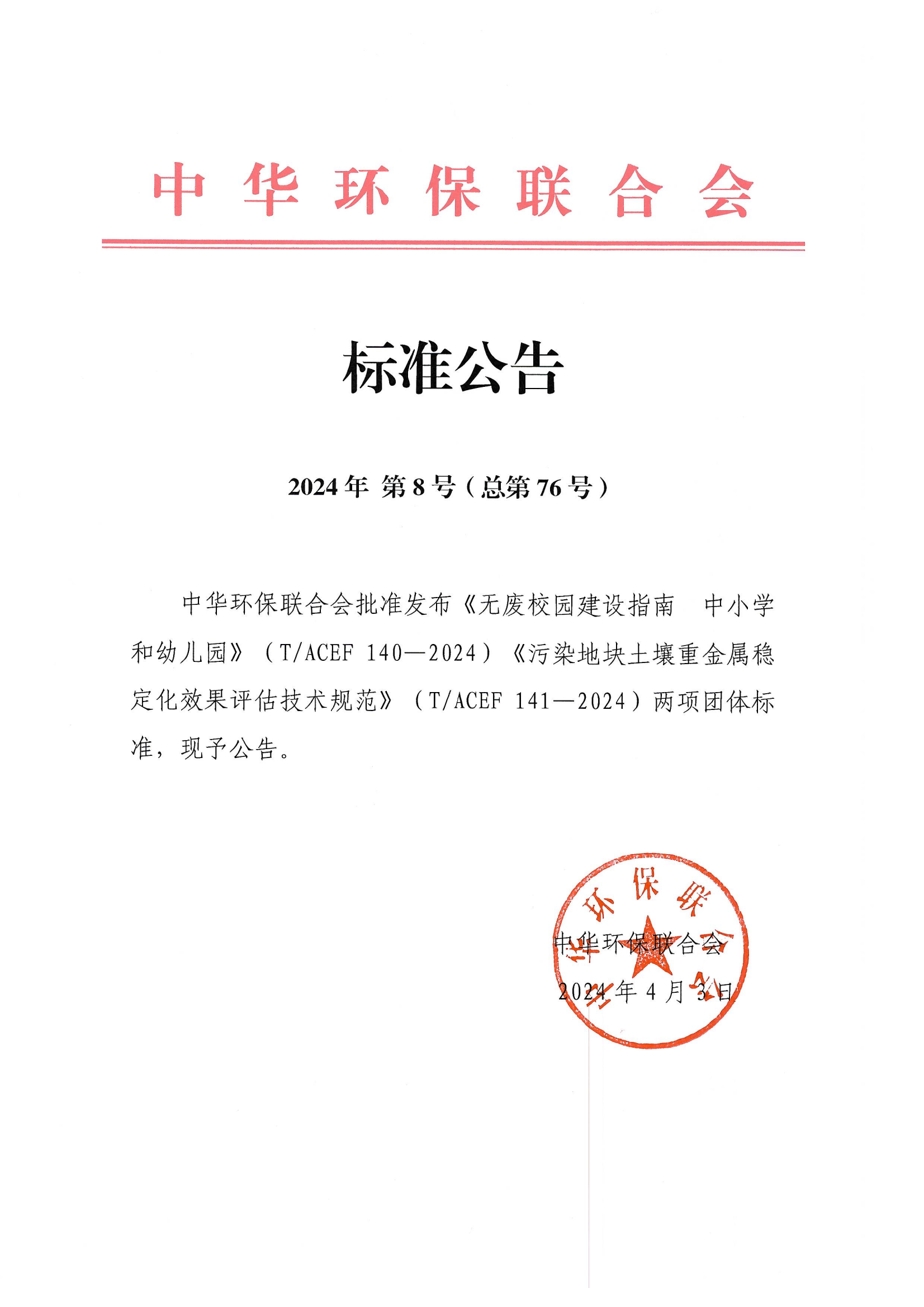 中华环保联合会发布2024年第8号(总第76号)团体标准公告