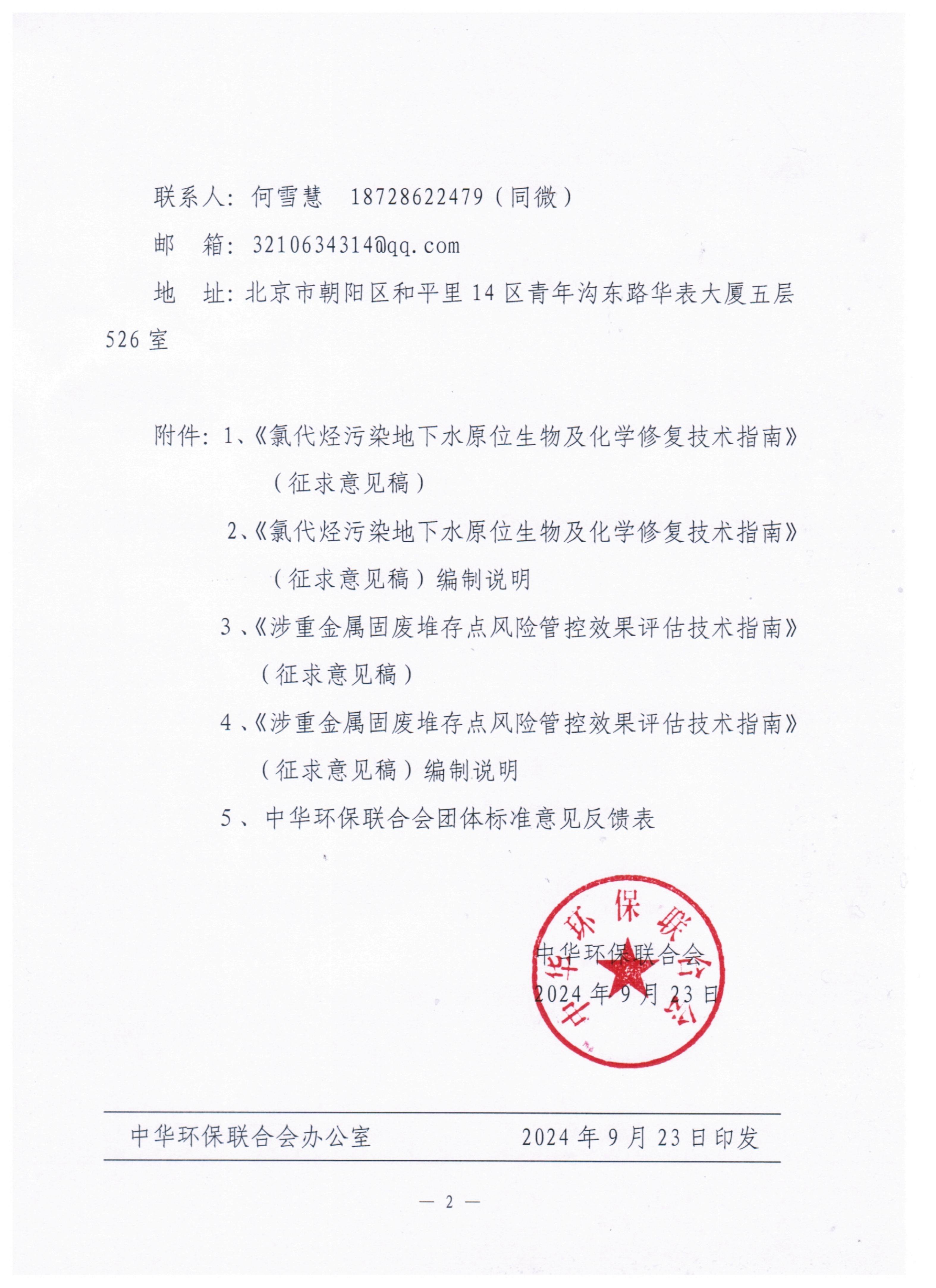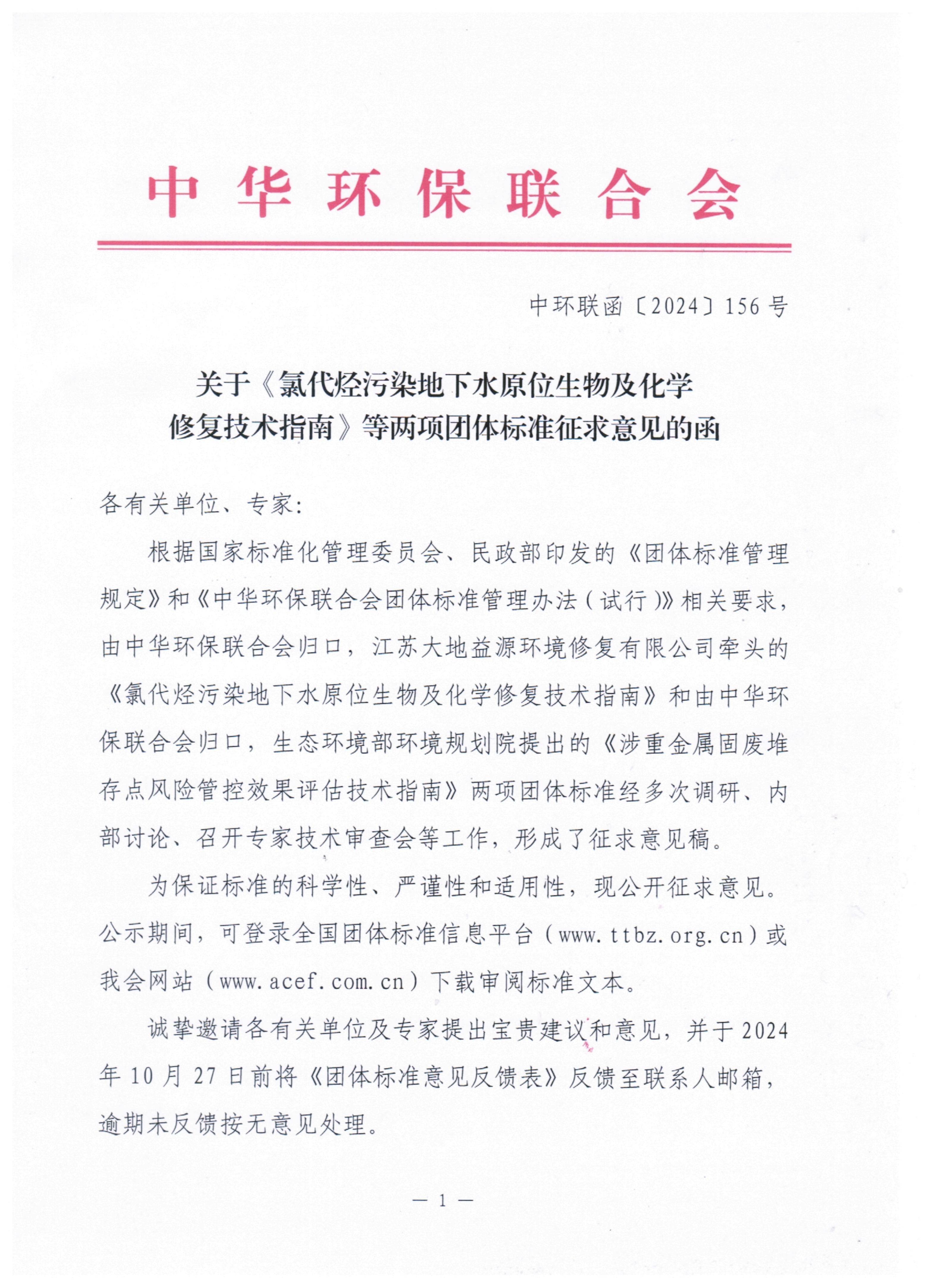 关于《氯代烃污染地下水原位生物及化学修复技术指南》 等两项团体标准征求意见的函