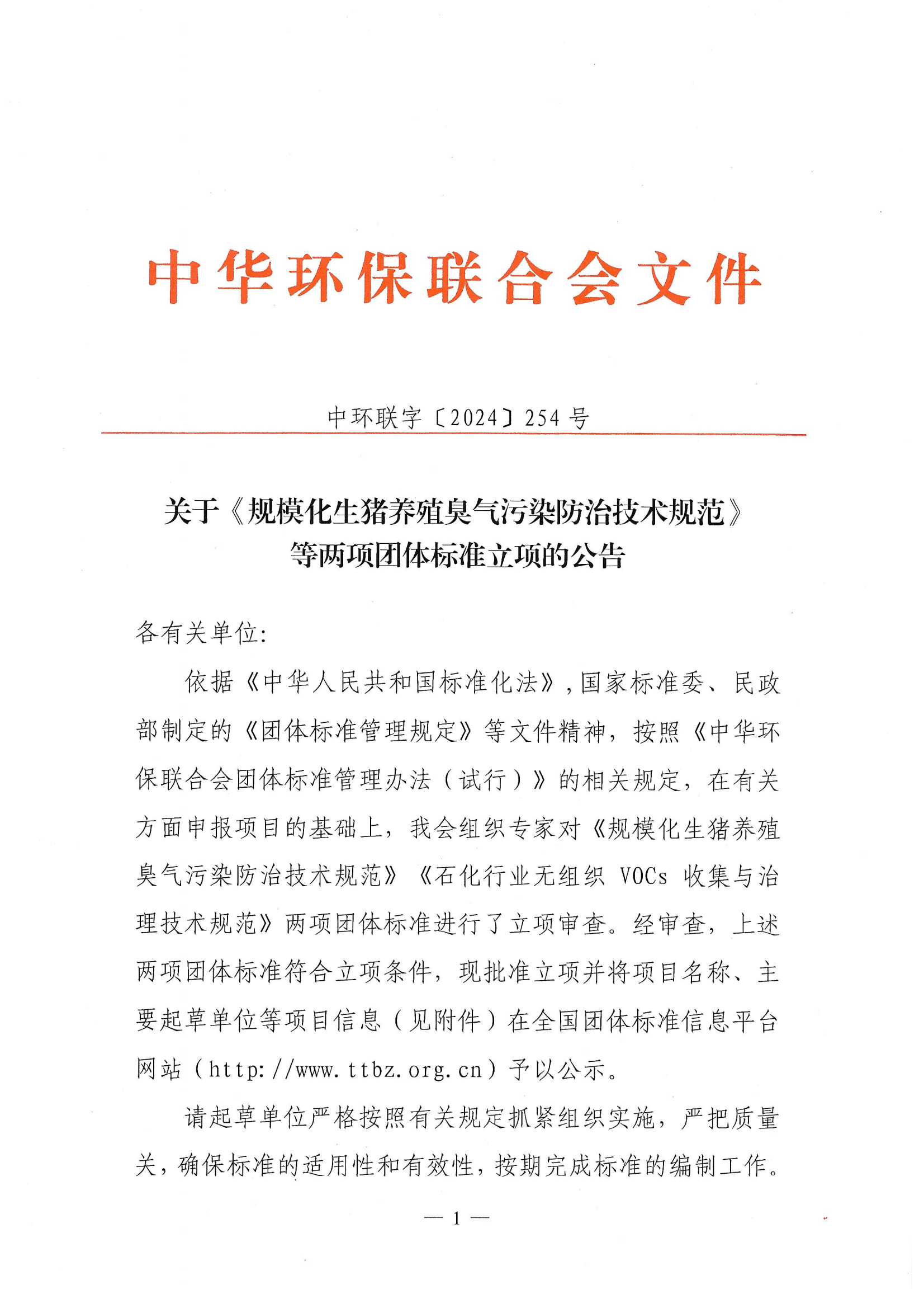 关于《规模化生猪养殖臭气污染防治技术规范》等两项团体标准立项的公告