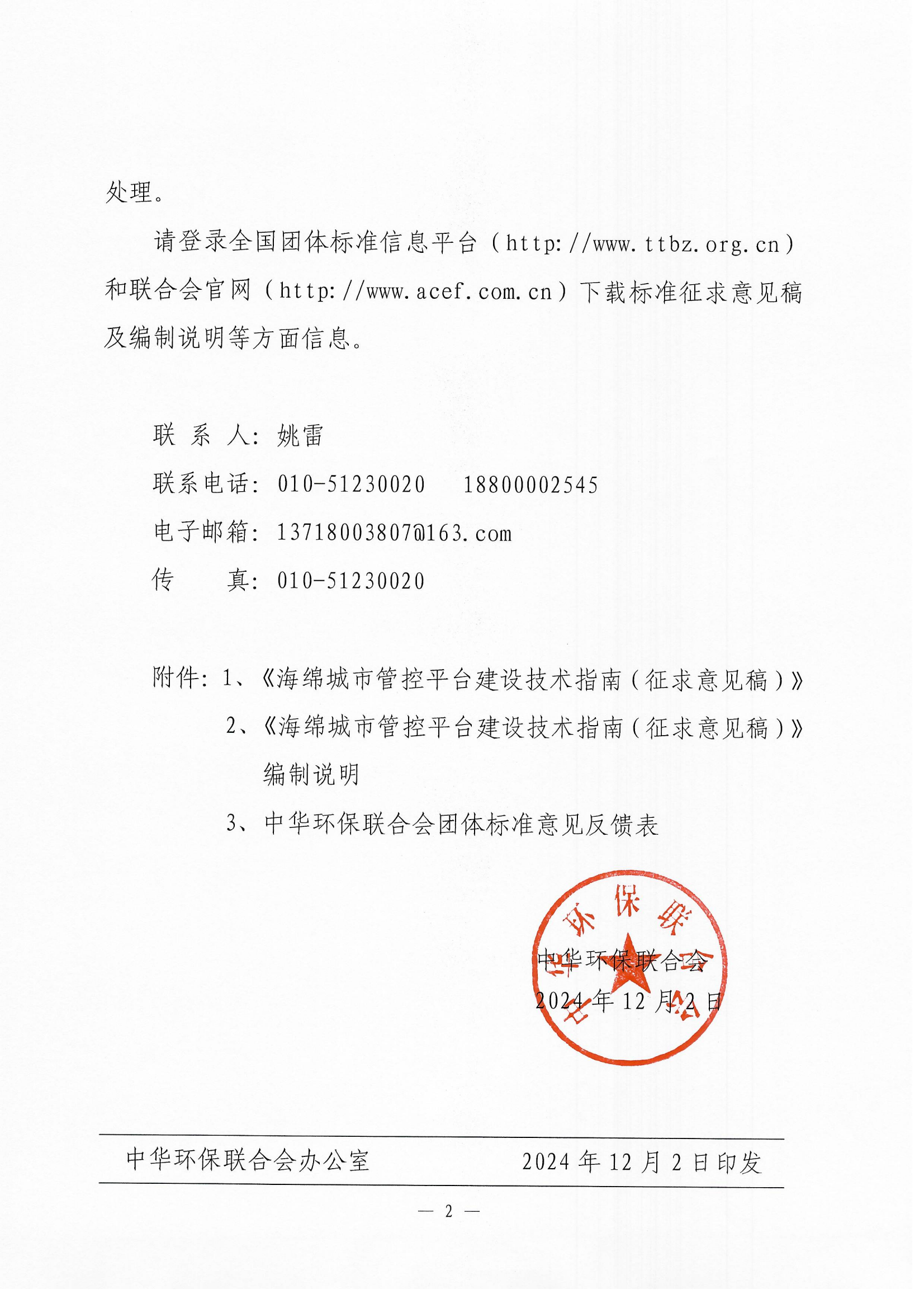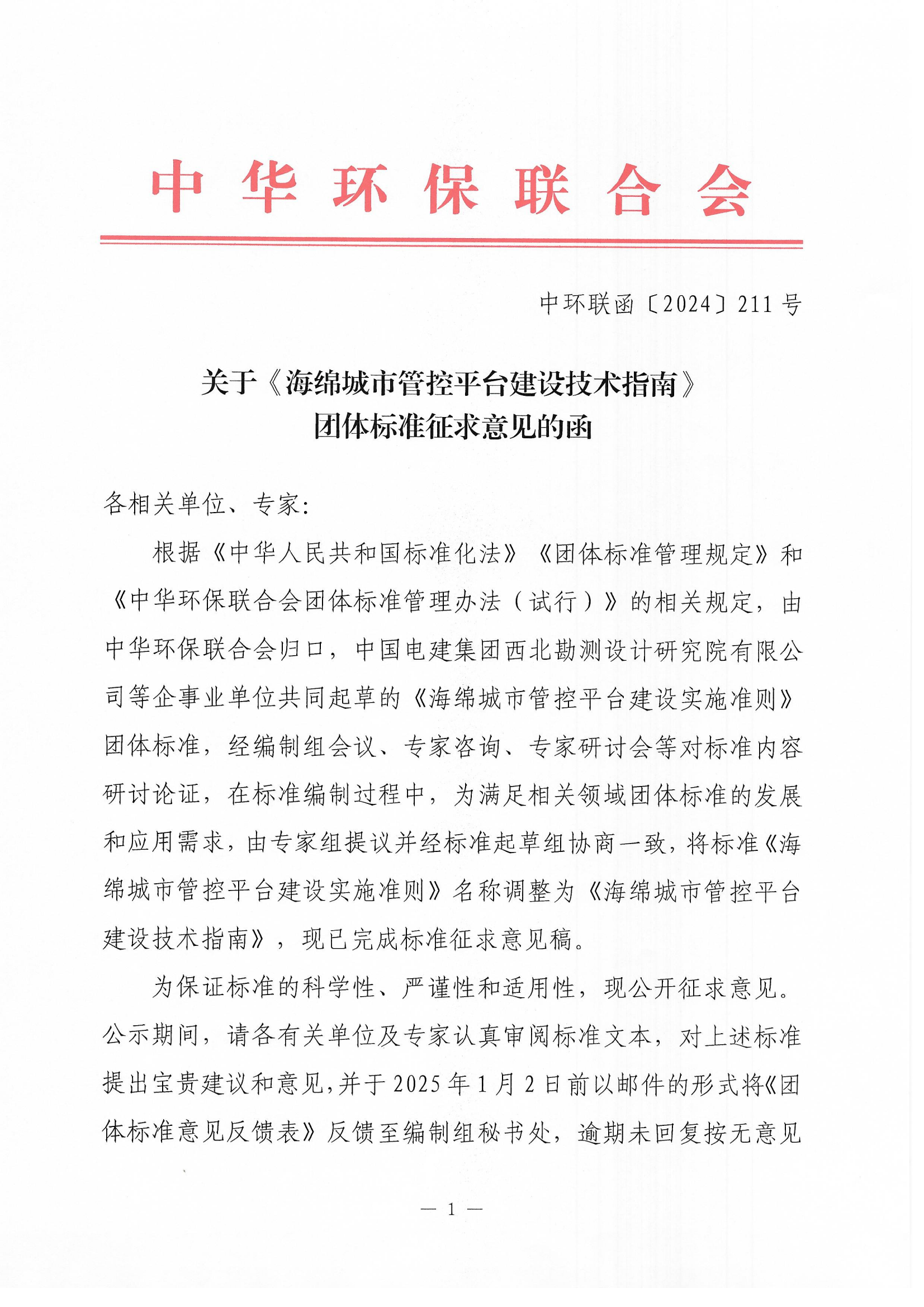 关于《海绵城市管控平台建设技术指南》 团体标准征求意见的函