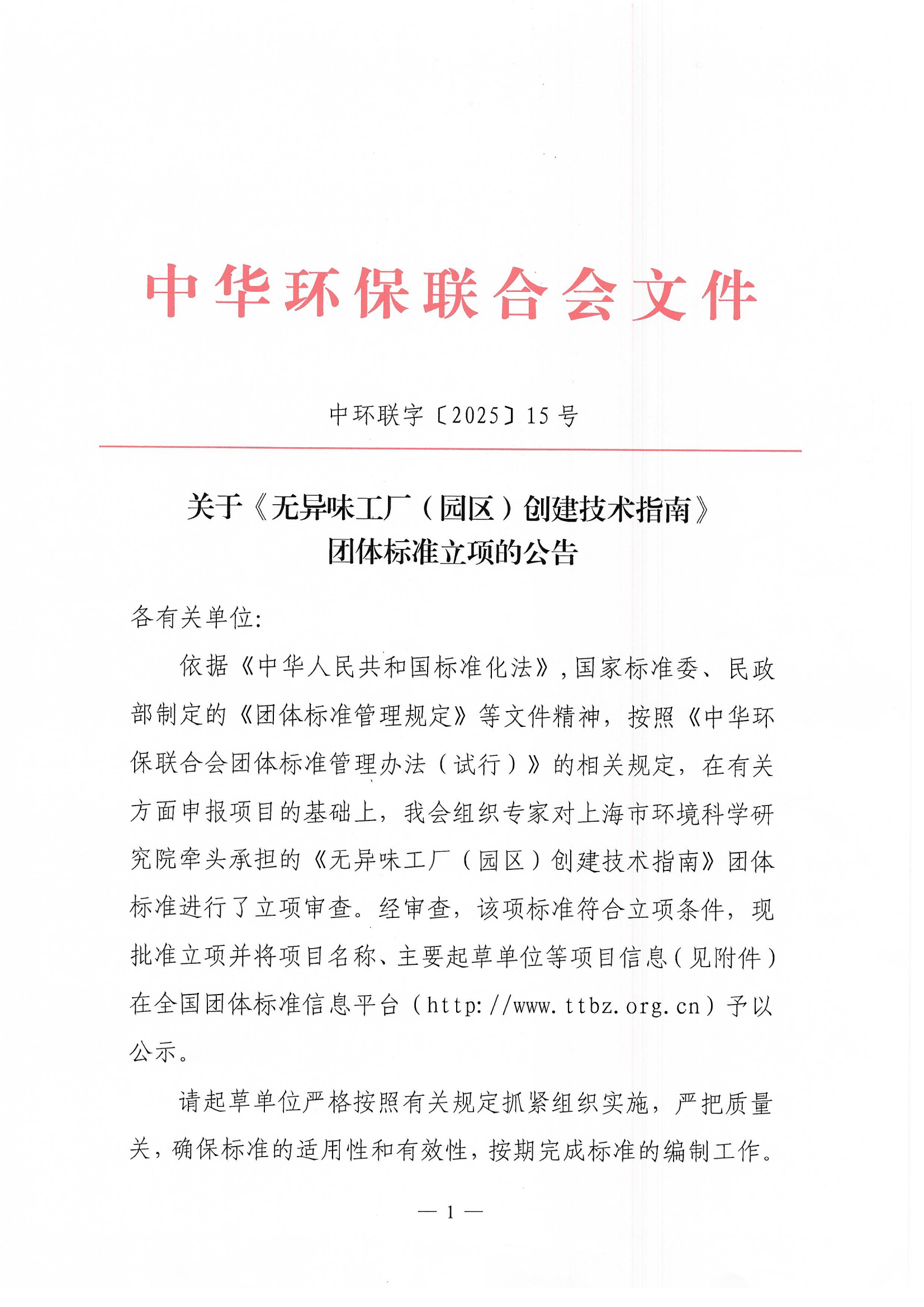 关于《无异味工厂(园区)创建技术指南》团体标准立项的公告