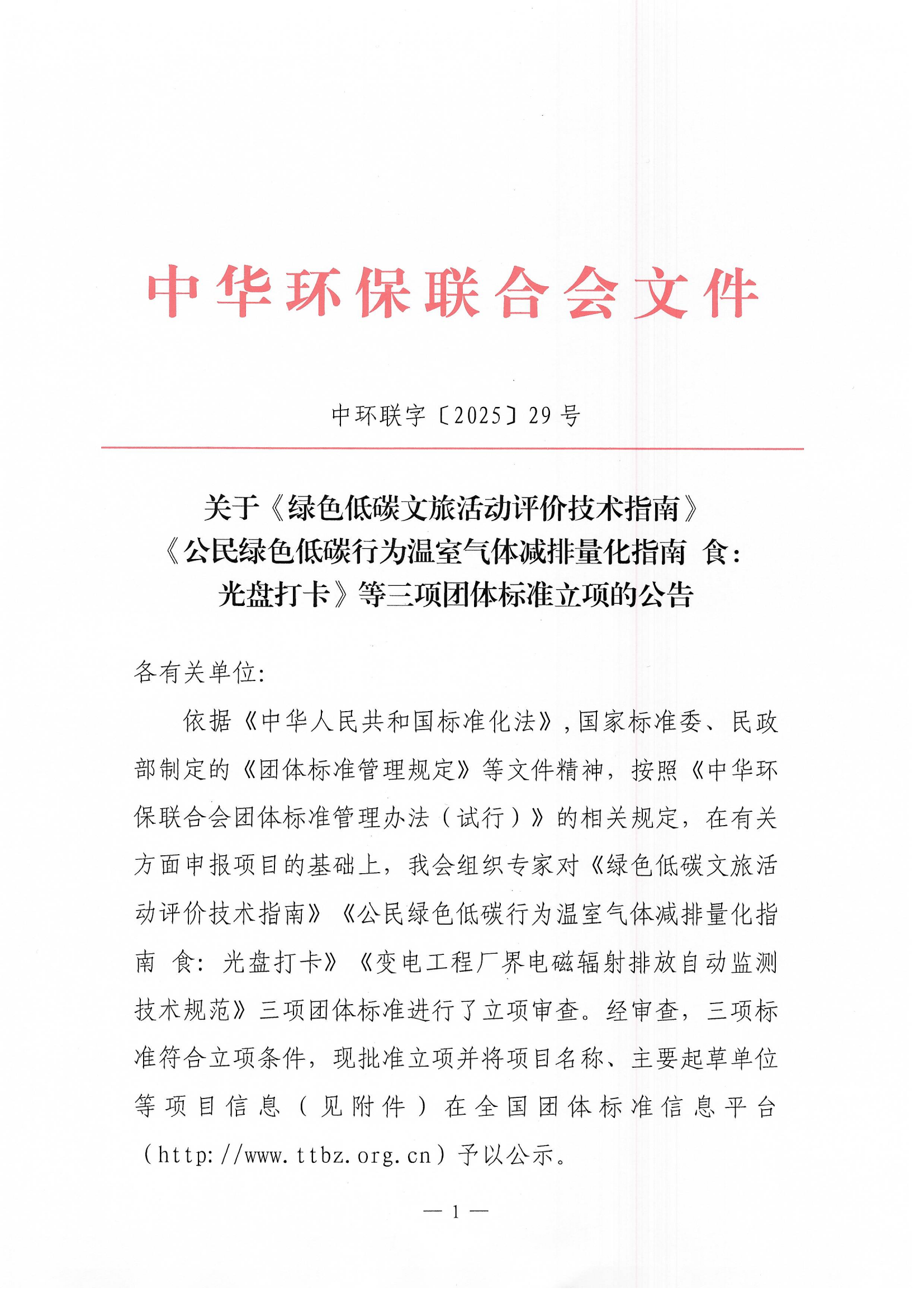 关于《绿色低碳文旅活动评价技术指南》《公民绿色低碳行为温室气体减排量化指南 食:光盘打卡》等三项团体标准立项的公告