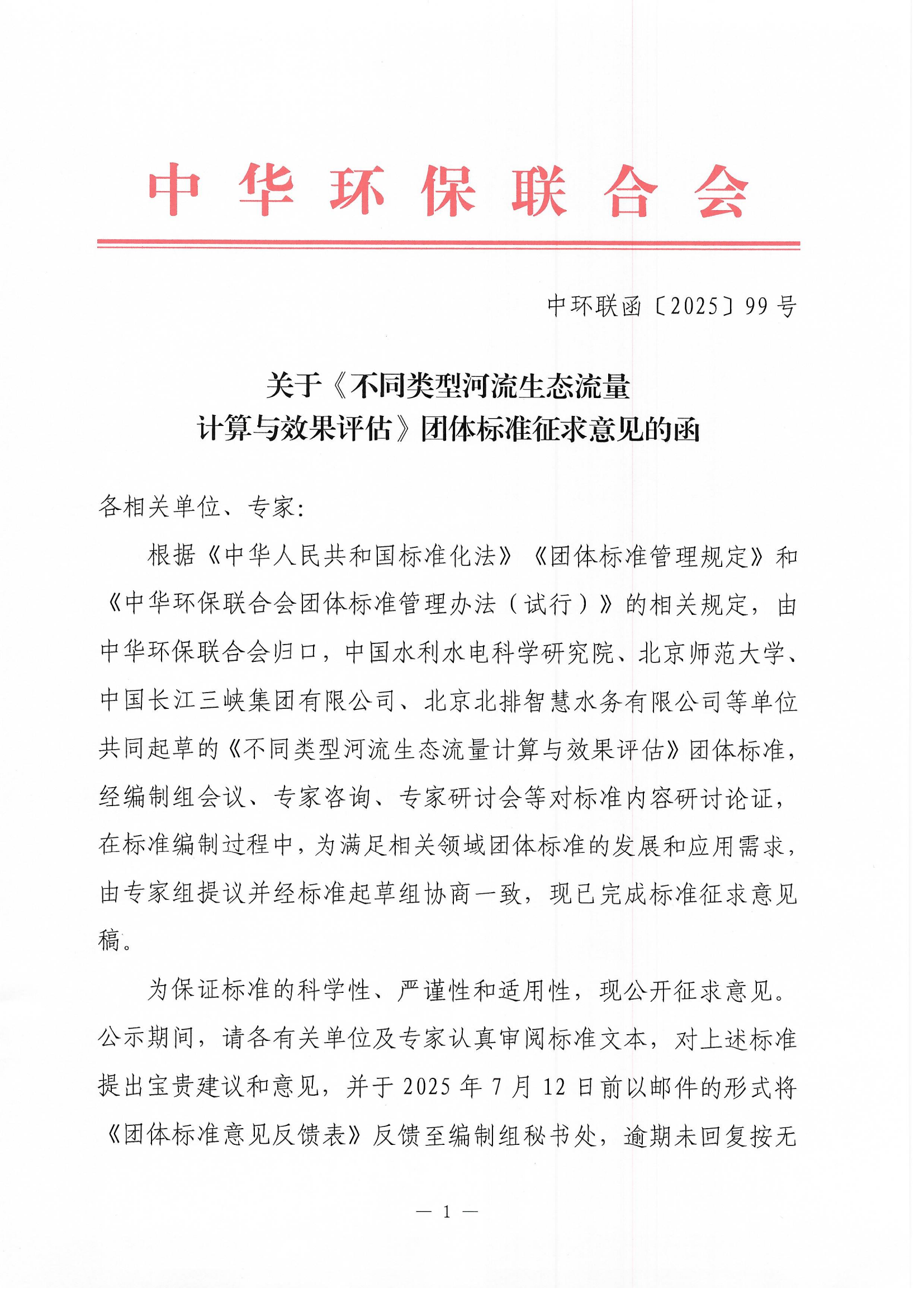 关于《不同类型河流生态流量计算与效果评估》团体标准征求意见的函
