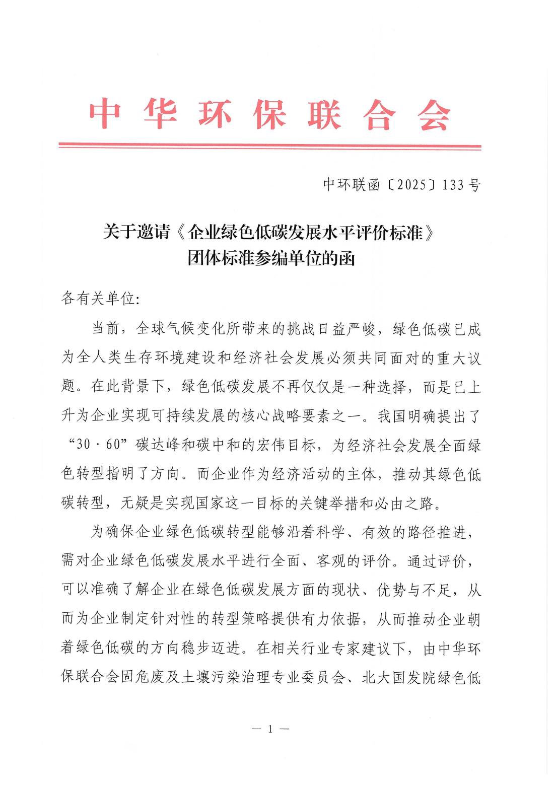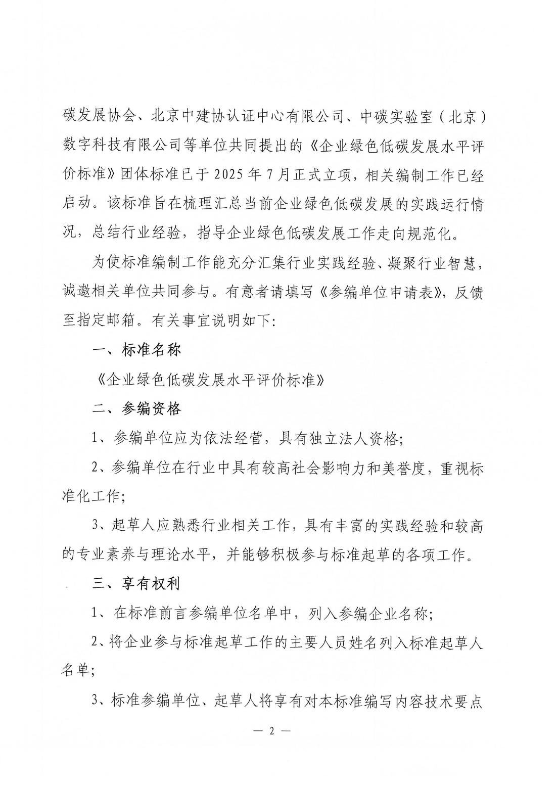 关于邀请《企业绿色低碳发展水平评价标准》团体标准参编单位的函