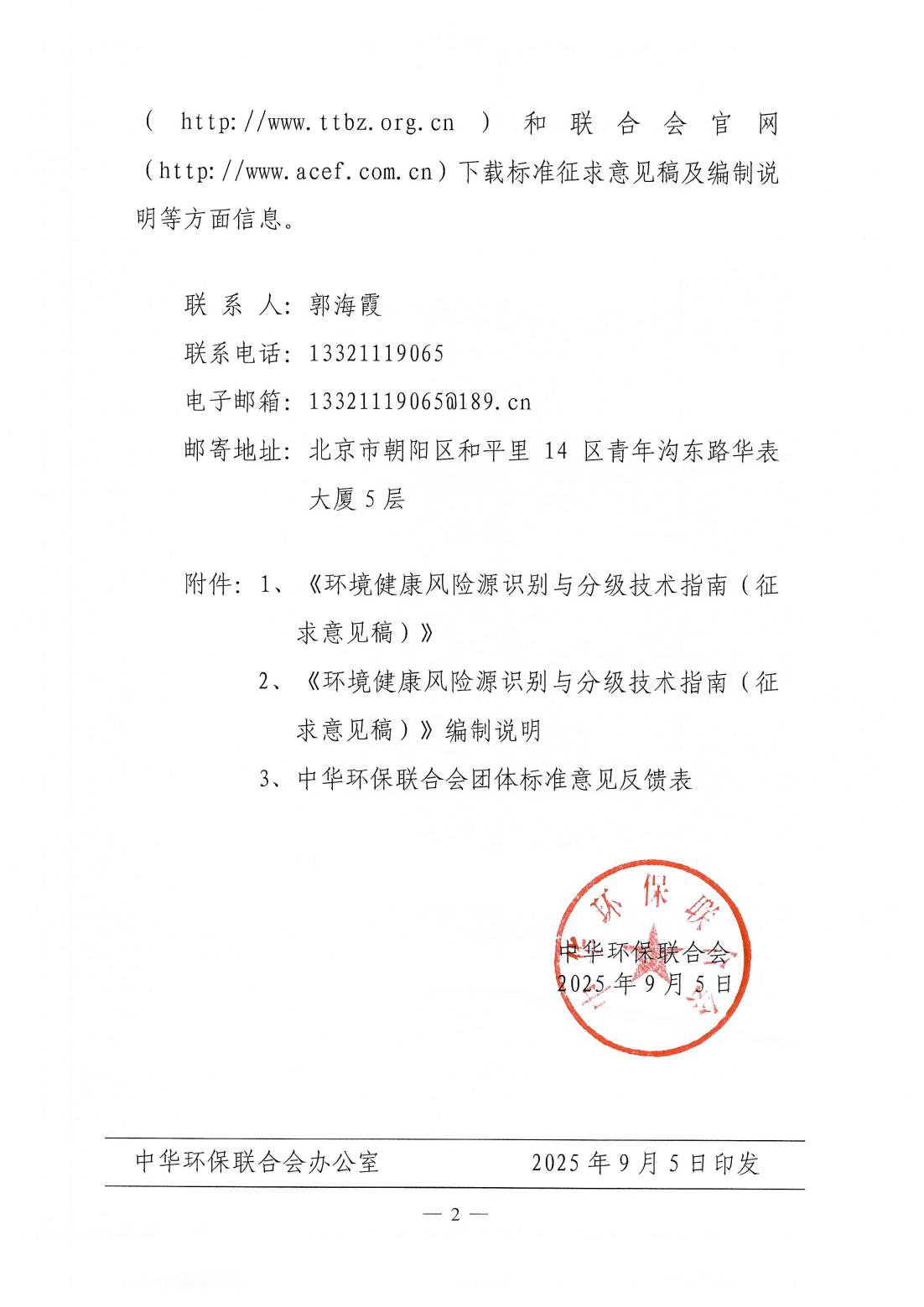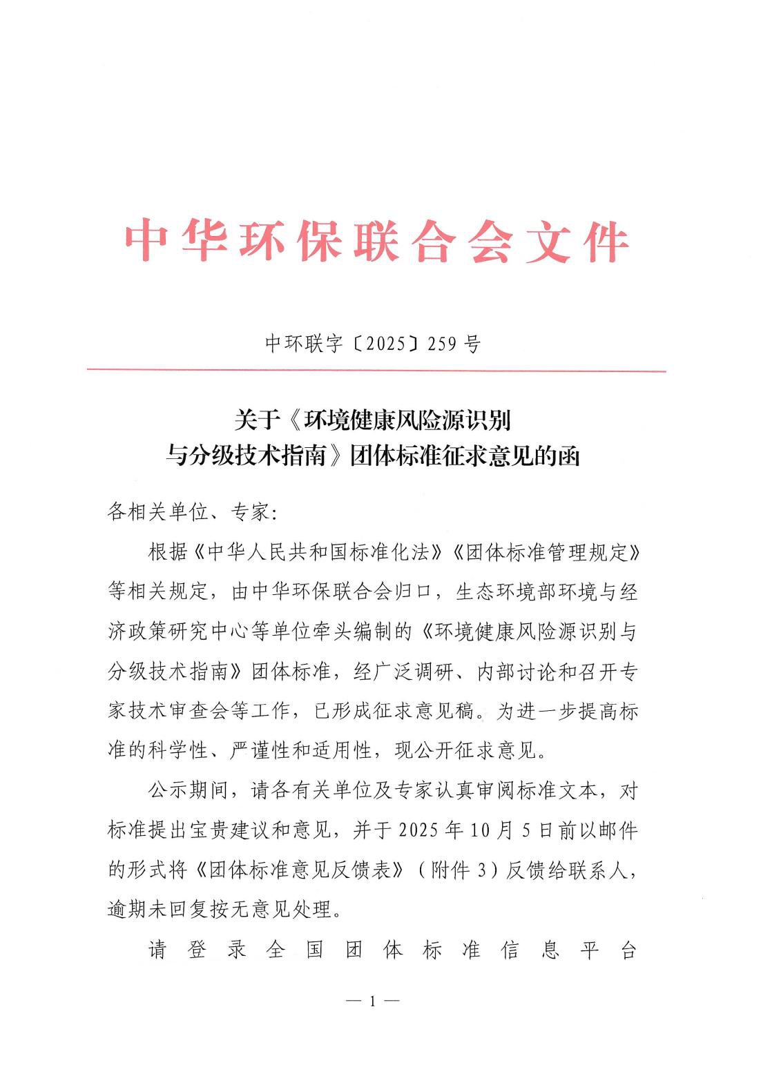 关于《环境健康风险源识别与分级技术指南》团体标准征求意见的函