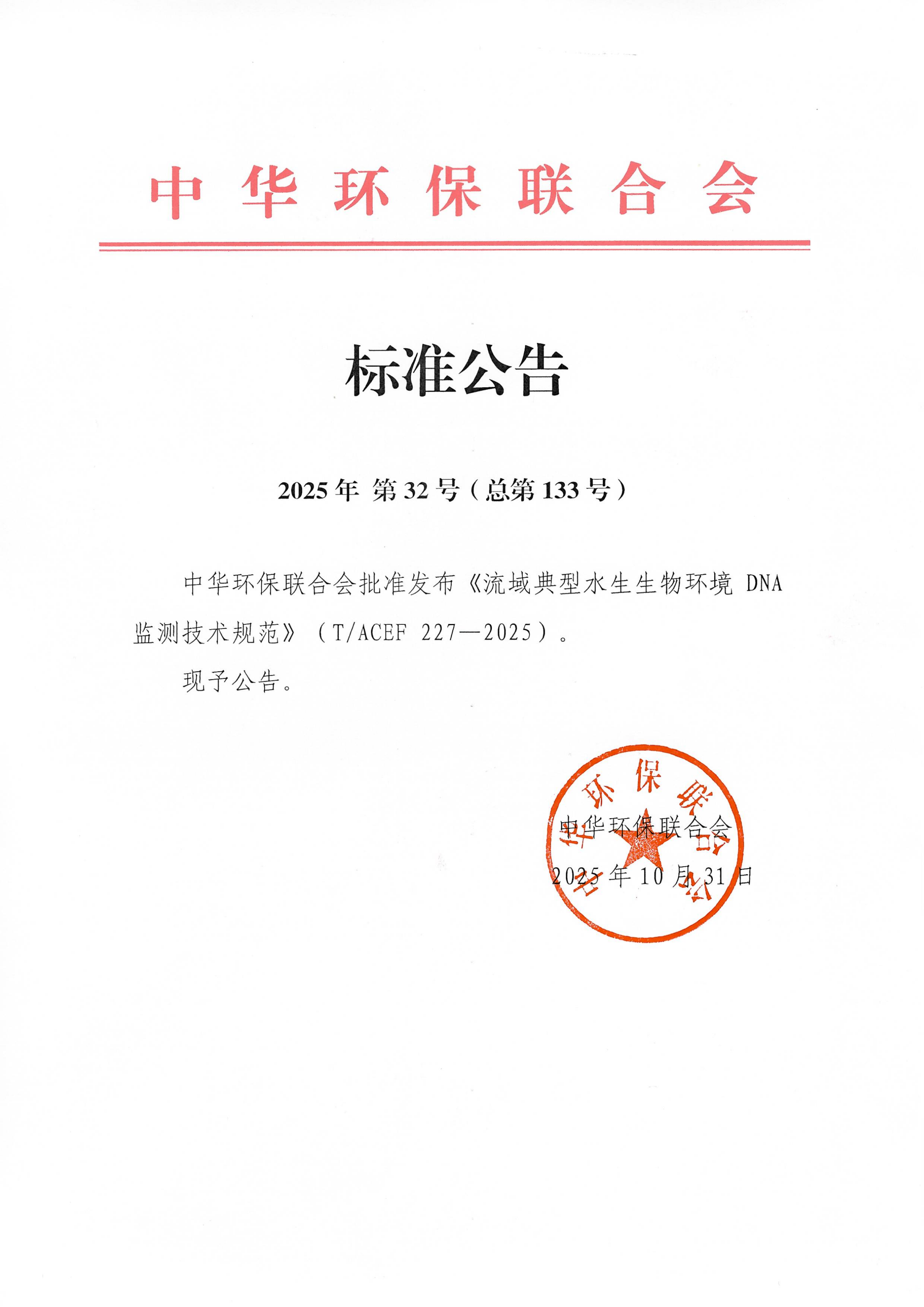 中华环保联合会批准发布《流域典型水生生物环境DNA监测技术规范》的公告