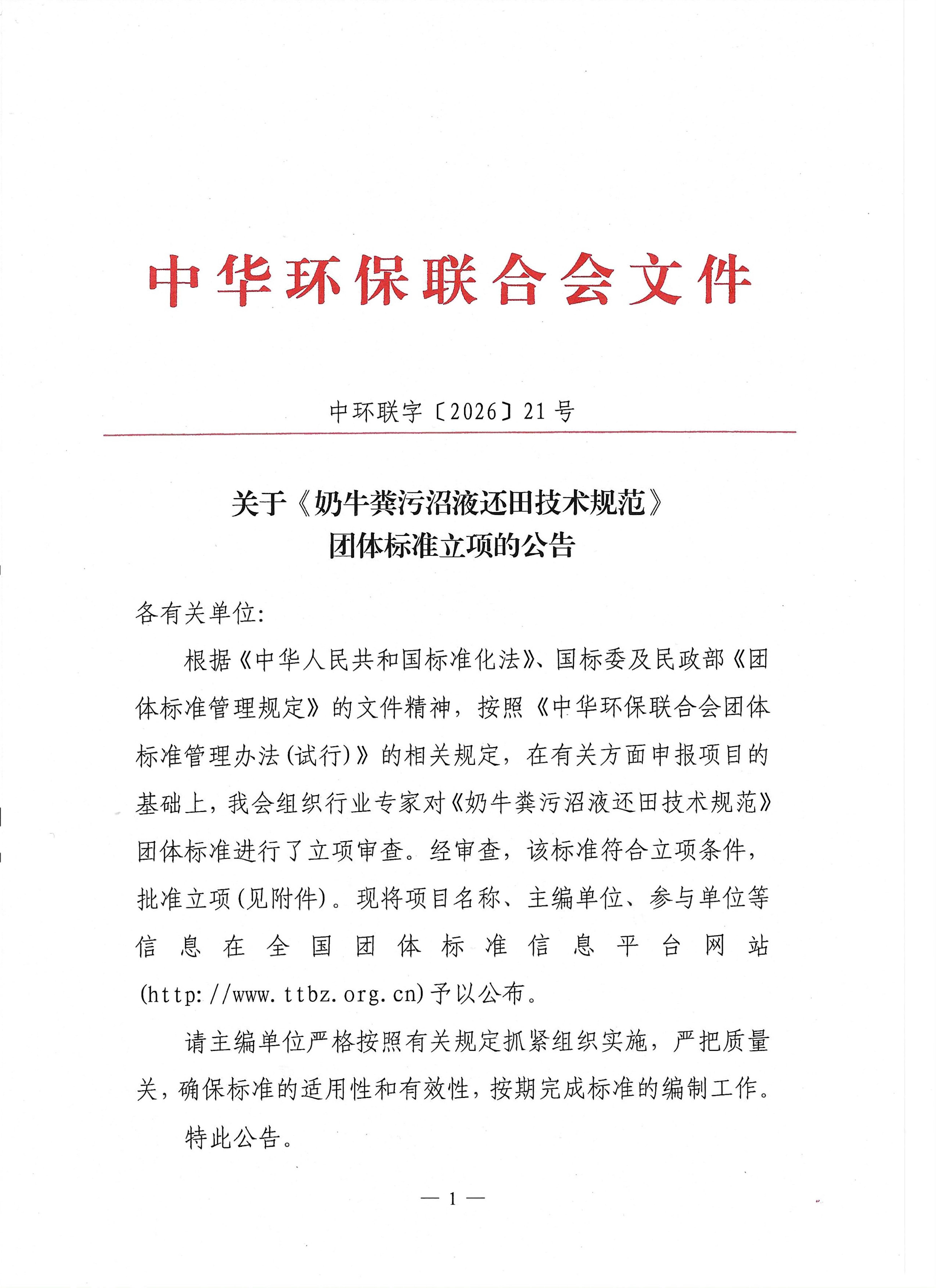 关于《奶牛粪污沼液还田技术规范》团体标准立项的公告