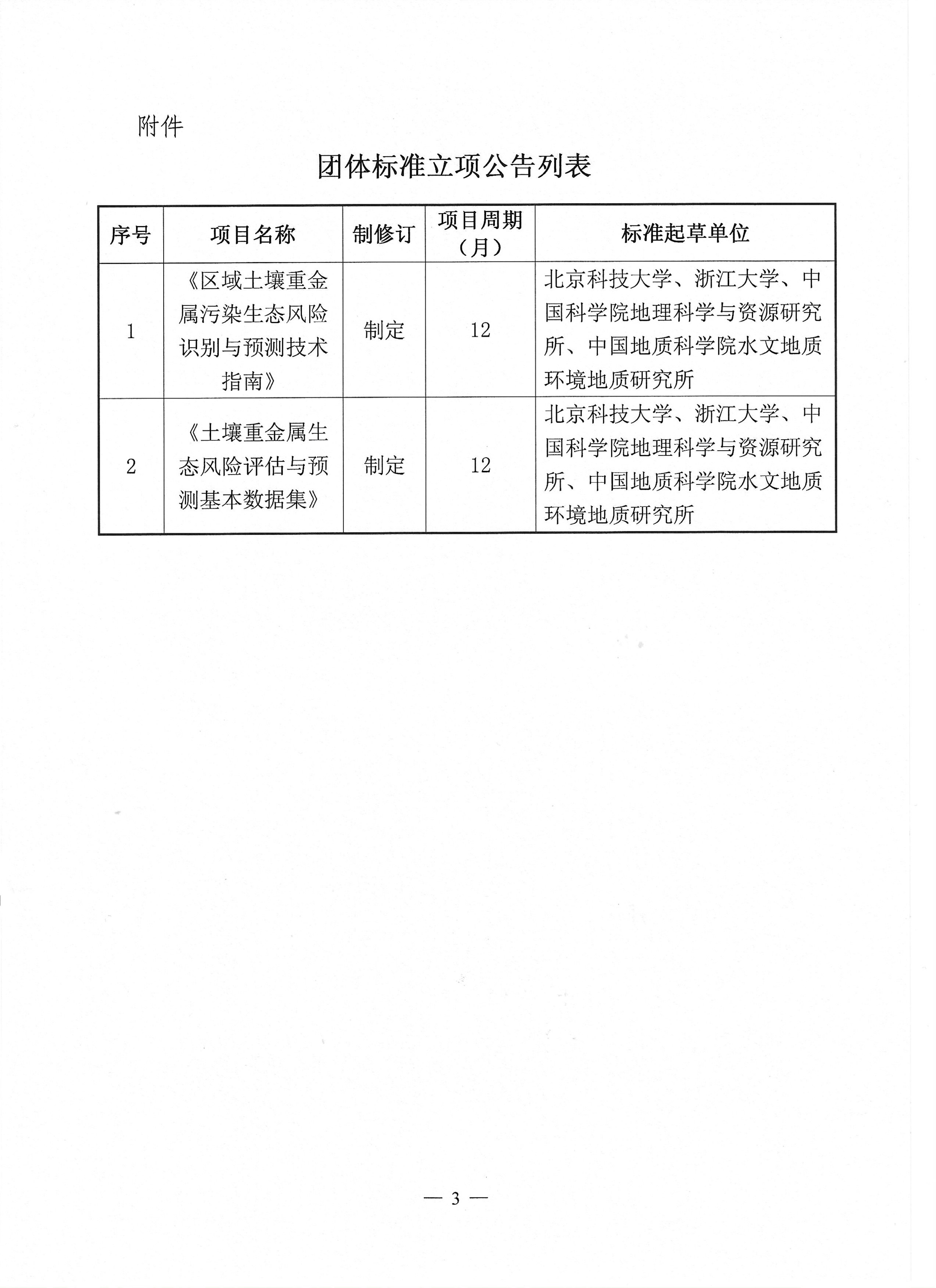 关于《区域土壤重金属污染生态风险识别与预测技术指南》等两项团体标准立项的公告