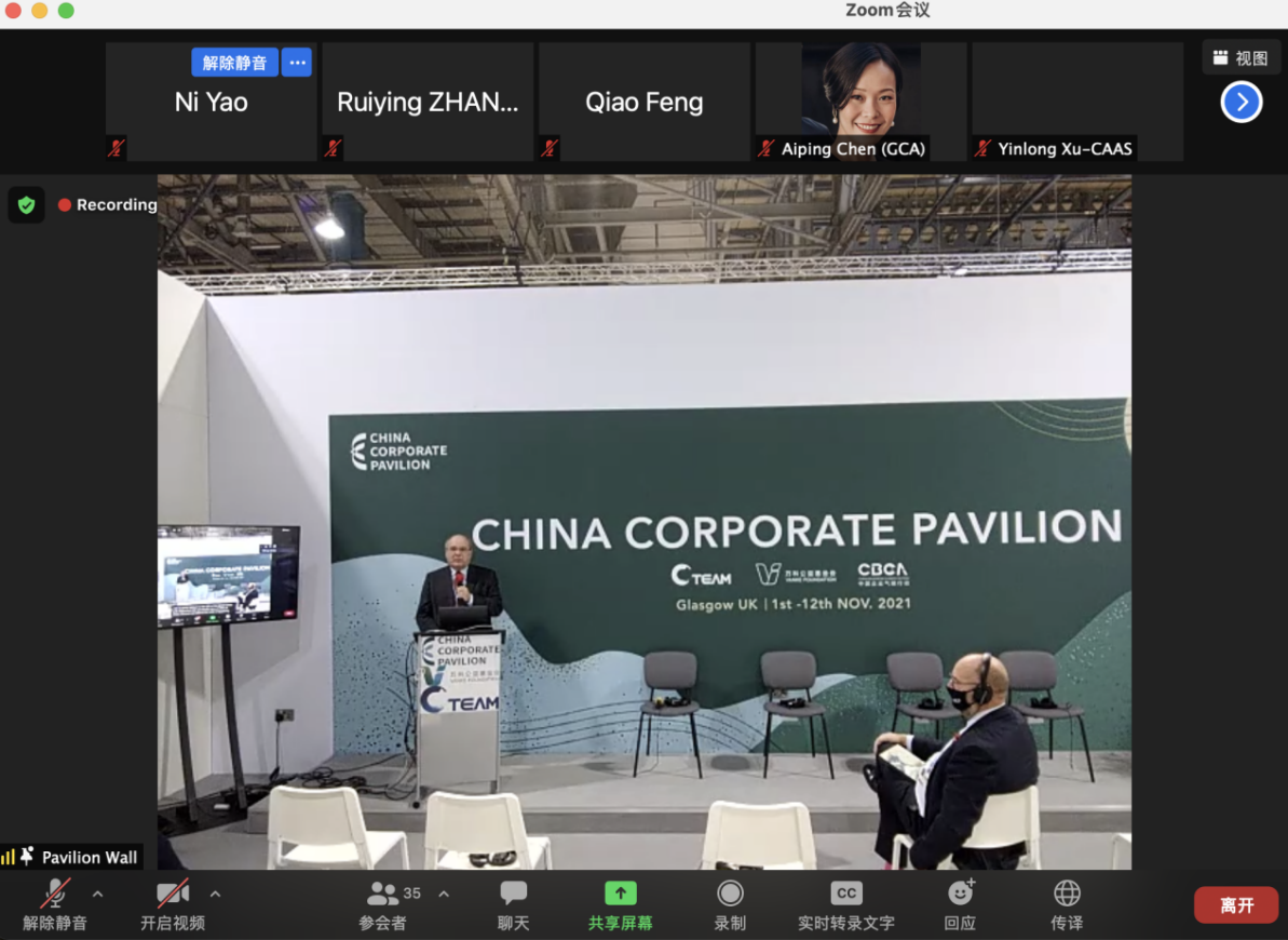 图6参与COP26中国企业馆气候适应合作圆桌论坛,并做关于民间组织参与气候适应的经验分享。中国企业馆现场也同期展播了谢玉红秘书长的COP26寄语。