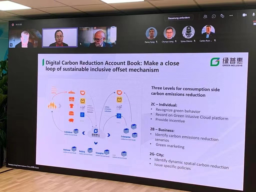 中华环保联合会绿色循环普惠专委会代表于COP26期间,受邀在UN Climate Change Global Innovation Hub Pavilion以及中国企业气候行动“带你看见碳中和”直播当中,围绕绿普惠云平台助力个人低碳消费的相关内容进行了分享。