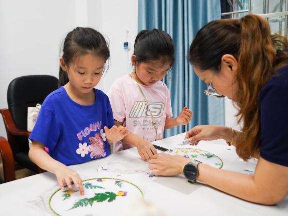 随后的趣味创意手工画环节,小朋友们接二连三地动起手来,积极地捡拾自然掉落的各种树叶、枝丫、花朵等,还有一些家长耐心地指导小朋友们如何辨认不同的植物。在工作人员细心的引导下,不一会儿,一块块空白的团扇变得五彩斑斓。孩子们的创造力被完全释放,高楼耸立的城市景观,勃发的花草树木,蜿蜒的山川河流,甚至还有飞鸟走兽,每一处细节都展现着他们丰富的想象力和对自然的热爱。