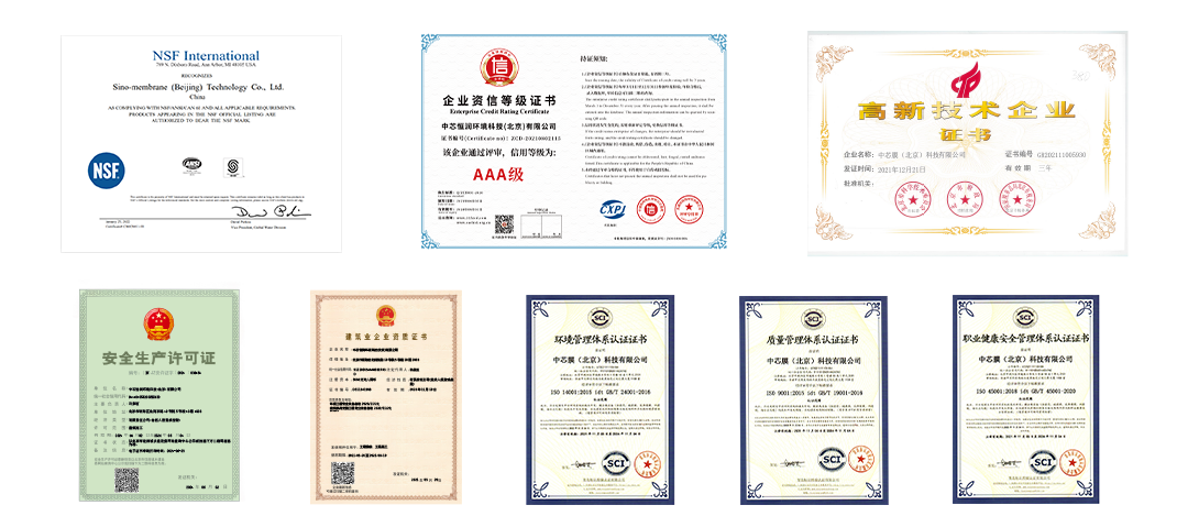中芯集团的制造企业通过iso9001、iso14001、职业安全健康管理、涉水批件等完备的管理认证,核心产业通过NSF61、国家海洋中心等权威认证,营销企业拥有分离膜各行业领域的全套工程施工资质。