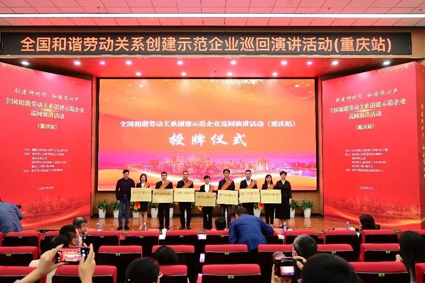 近日,三峰环境集团被人力资源社会保障部、中华全国总工会、中国企业联合会/中国企业家协会、中华全国工商业联合会联合授予“全国和谐劳动关系创建示范企业”称号,并在全国和谐劳动关系创建示范企业巡回演讲活动(重庆站)上授牌。