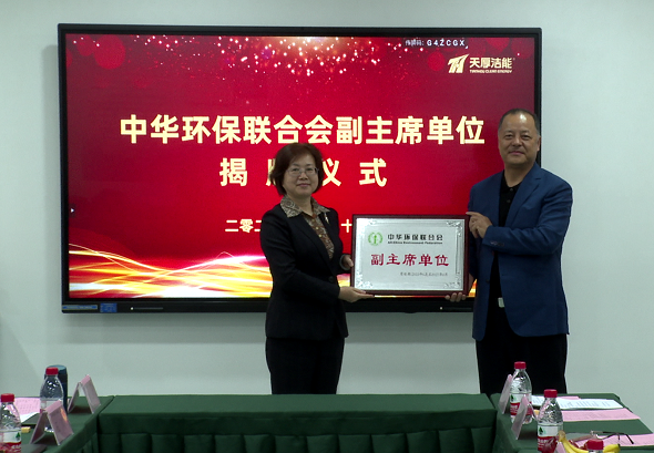 中华环保联合会副主席兼秘书长谢玉红为西安天厚滤清技术有限责任公司颁发副主席单位牌匾和证书