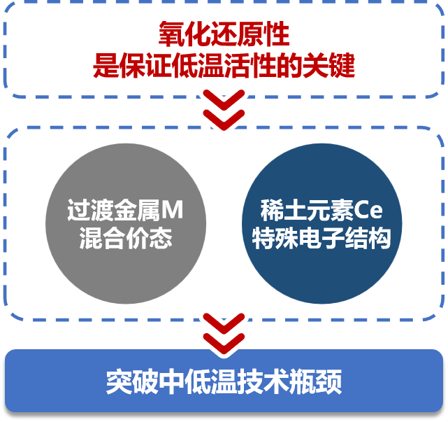◆提出了过渡金属耦合稀土元素作用思路,突破中低温高效脱硝技术瓶颈。