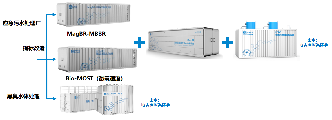 MagBR磁介质生物反应器是应用于分散式污水处理的一体化生化处理系统,以传统MBBR和SMBR为工艺基础,通过在好氧反应单元投加具有完全自主知识产权的磁性悬浮材料,强化生化反应效果。磁性载体在该产品中的创新型运用,降低了生物种群丰度,提高了优势菌群比例,优化了微生物群落结构。