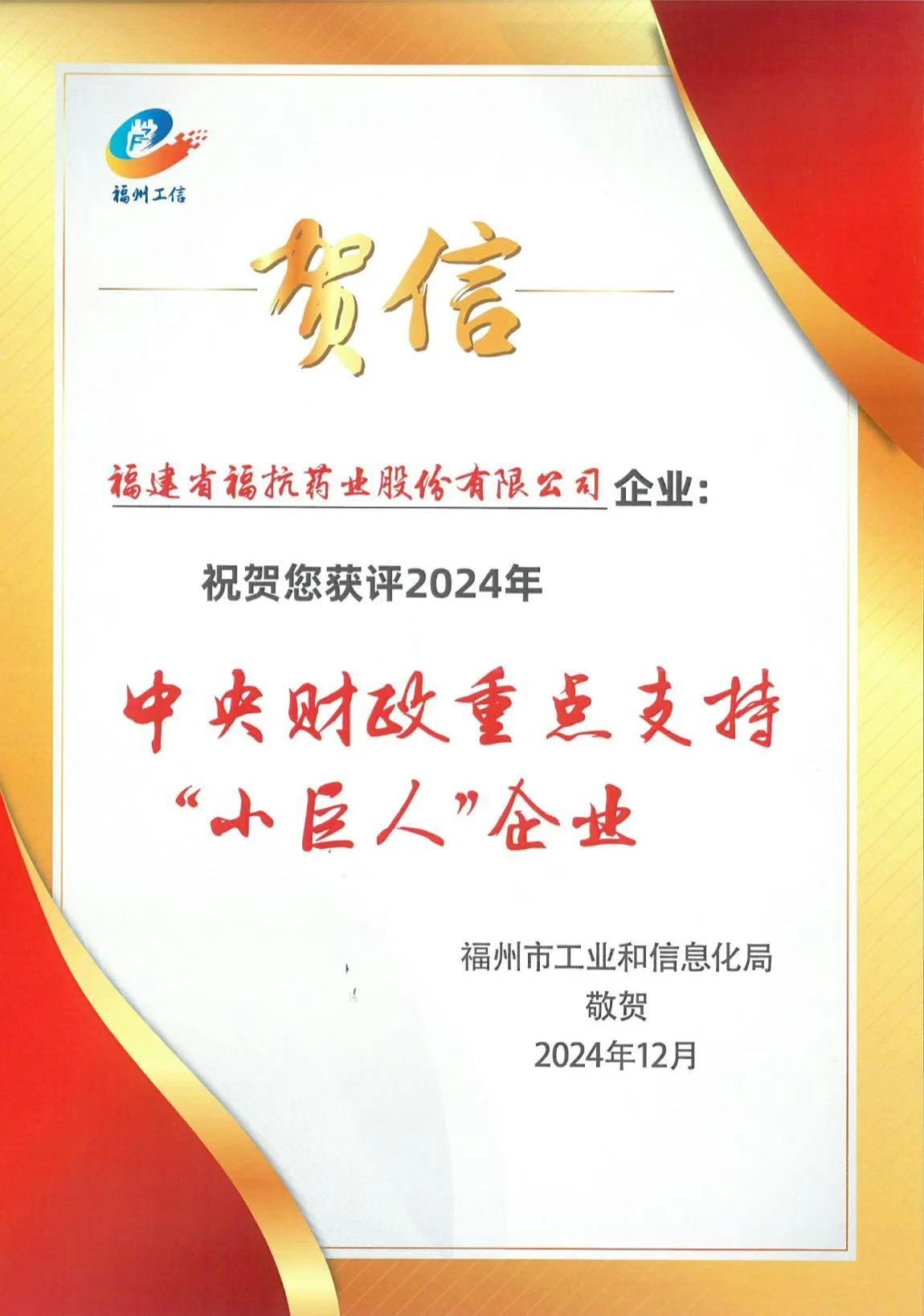 2024年12月10日,福州市工业和信息化局发来贺信,祝贺我司荣获2024年中央财政重点支持“小巨人”企业!