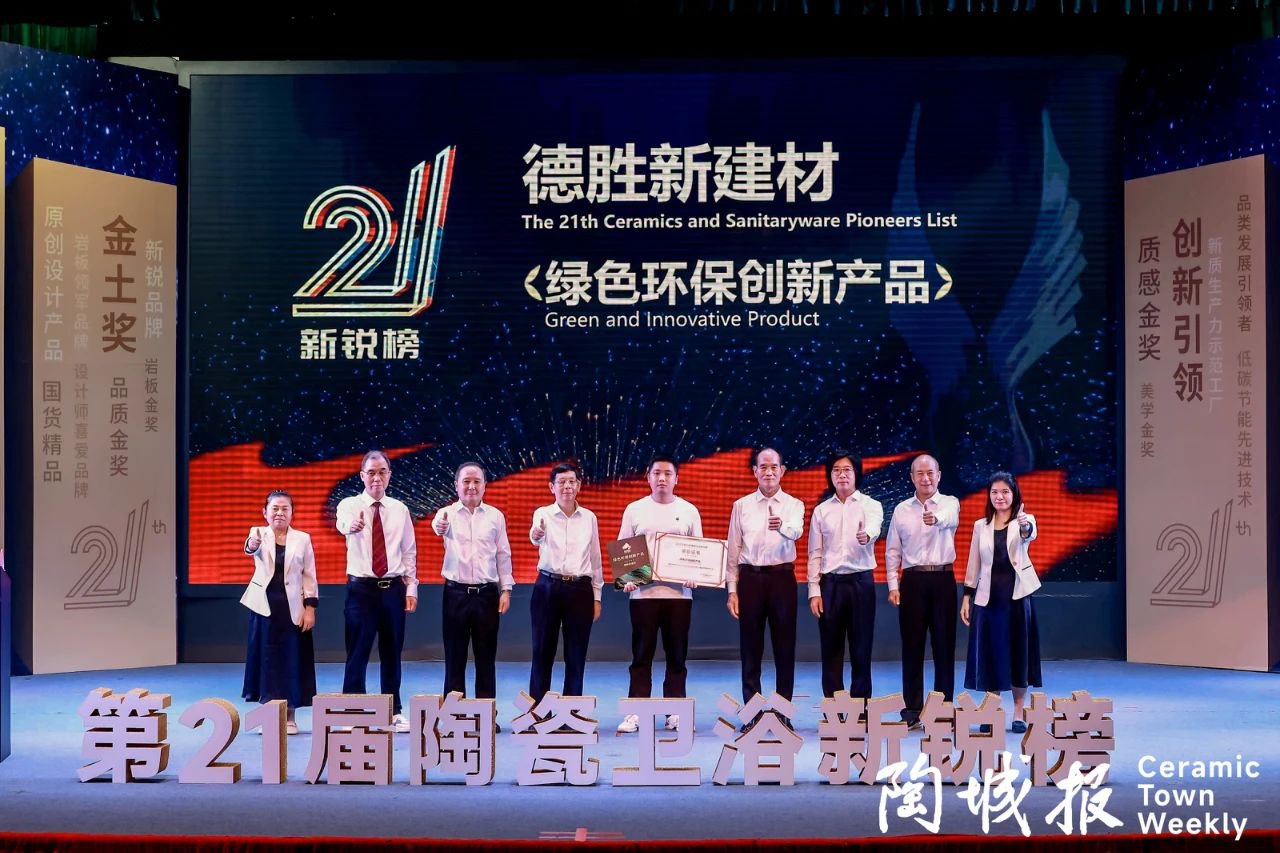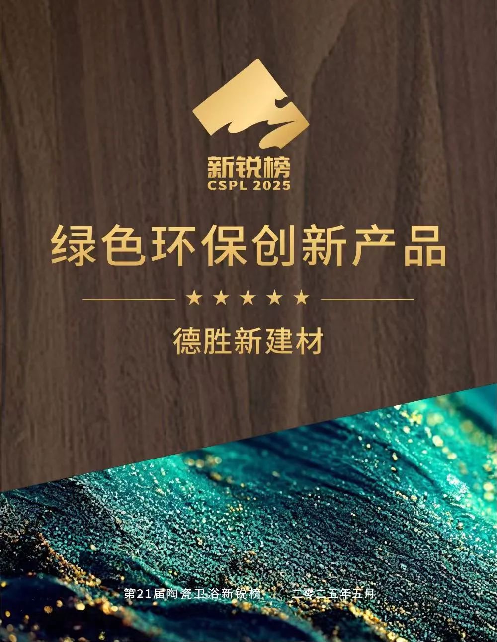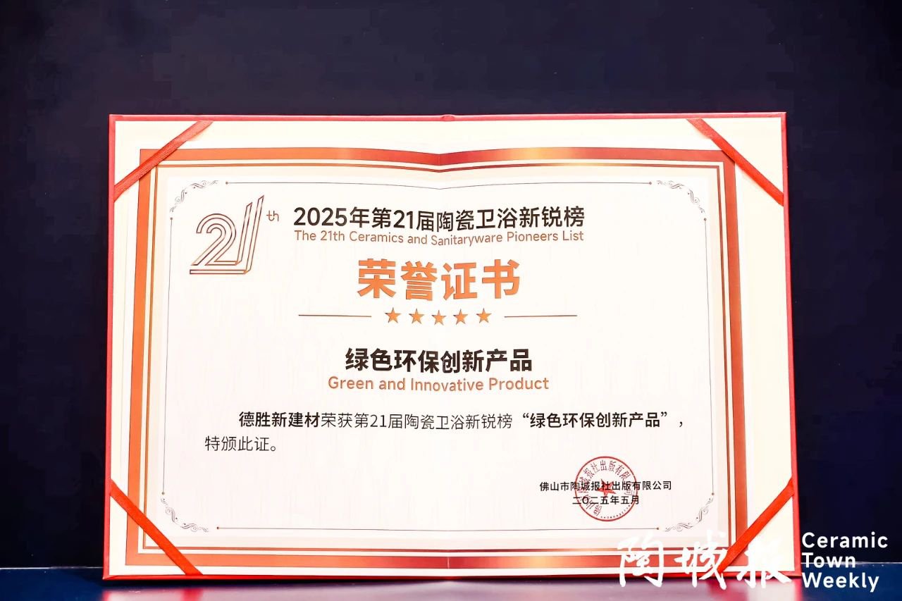 近日,在第 21 届陶瓷卫浴新锐榜评选中,福建德胜新建材有限公司凭借卓越的产品实力和绿色创新理念,成功斩获 “绿色环保创新产品” 大奖!这一荣誉的获得,不仅是行业对德胜新建材的高度认可,更是公司多年来坚持品质为先、践行绿色发展的有力见证。