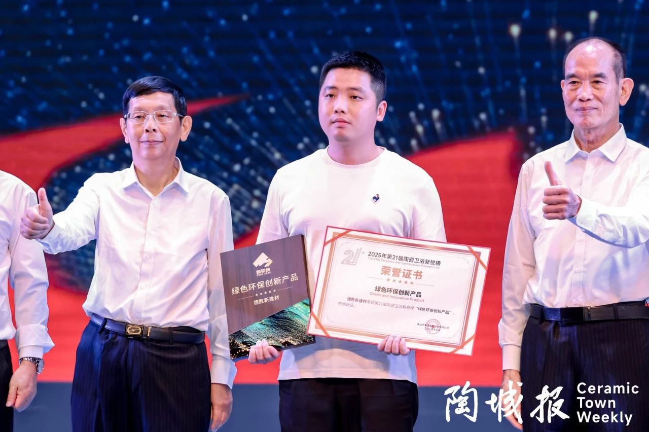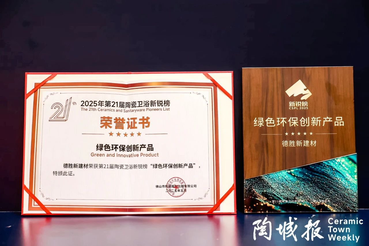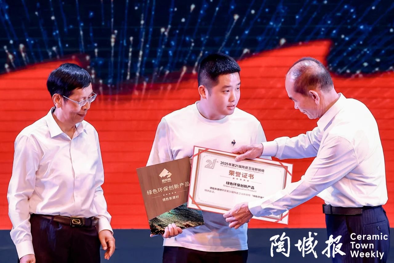 近日,在第 21 届陶瓷卫浴新锐榜评选中,福建德胜新建材有限公司凭借卓越的产品实力和绿色创新理念,成功斩获 “绿色环保创新产品” 大奖!这一荣誉的获得,不仅是行业对德胜新建材的高度认可,更是公司多年来坚持品质为先、践行绿色发展的有力见证。