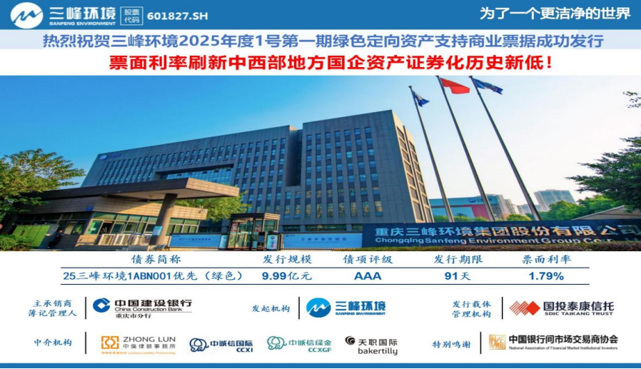 近日,三峰环境集团在银行间市场完成2025年度第一期绿色资产支持商业票据(简称“ABCP”)的簿记发行。本期发行规模为10亿元(其中:优先级9.99亿元),发行期限为91天,票面利率为1.79%,认购倍数2.15倍,票面利率刷新中西部地方国企资产证券化历史新低。