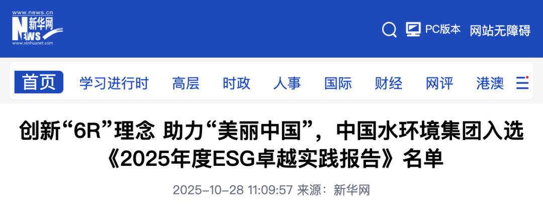 近日,ESG中国·创新年会(2025)暨首届ESG国际博览会在北京首钢园召开。大会正式发布了《2025年度ESG卓越实践报告》,中国水环境集团凭借《创新“6R”理念,推动水环境可持续发展——以分布式下沉再生水生态系统技术破解资源困局》案例从213家申报企业中脱颖而出,与中核集团、中国移动、华润集团、浦发银行、京东、腾讯等36家知名企业入选,为更多中国企业走向可持续发展道路提供了实践样板。