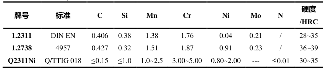 表1 Q2311Ni和传统塑料模具钢成分及硬度对比(wt%)