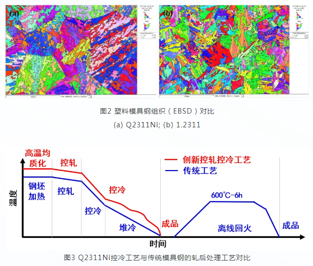 轧后冷却工艺是决定塑料模具钢性能和冶金质量的关键一环。基于相变动力学计算模拟,开发了轧后控冷工艺,获得全板厚均匀的贝氏体组织和硬度分布。Q2311Ni和1.2311模具钢的组织如图2所示,可以看出Q2311Ni为均匀的粒状贝氏体,1.2311为板条状马氏体组织。与传统的轧后热处理工艺流程相比(图3),Q2311Ni无需经过长达20h的600℃左右的高温回火热处理,提高了生产效率,降低了工序成本,吨钢碳排放降低0.24吨CO2,节能减排效果显著。