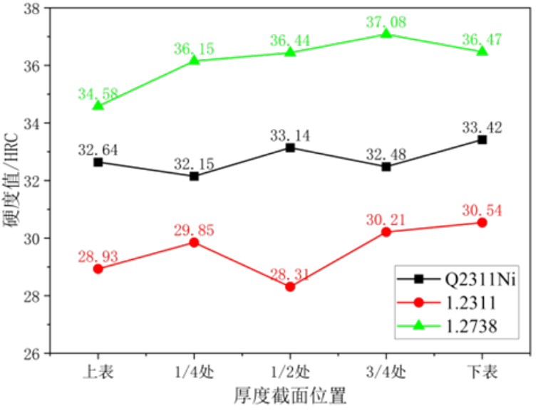 通过合金成分–控冷工艺-相变组织的三位一体硬度控制模型,15~120mm厚Q2311Ni钢板截面硬度水平HRC32-34之间,最大硬度差≤2HRC,硬度分布均匀。以32mm厚钢板为例,Q2311Ni和对比钢的整个截面硬度分布如图4所示。显然,Q2311Ni的截面最大硬度差值仅1.3HRC,其分布均匀性显著优于1.2311(最大硬度差值为2.2HRC)和1.2738(最大硬度差值2.5HRC)。实际上,钢板越厚,1.2311和1.2738钢板的截面硬度差越大,分布均匀性更差,而Q2311Ni依然保持均匀的硬度分布。