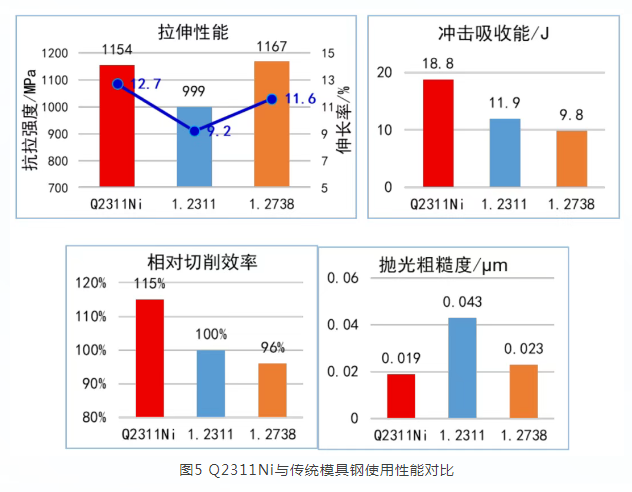 Q2311Ni塑料模具钢相比1.2311和1.2738具有更高的塑韧性、切削加工效率、抛光性能和力学性能,如图5所示,Q2311Ni的抗拉强度达到1154MPa,相比1.2311提高约15%,可承受更大载荷;伸长率提高30%;冲击吸收能达到18.8J,提升57%以上,切削加工效率提升15%,抛光后粗糙度Ra=0.019μm,降低56%,表面抛光效果如图1所示。