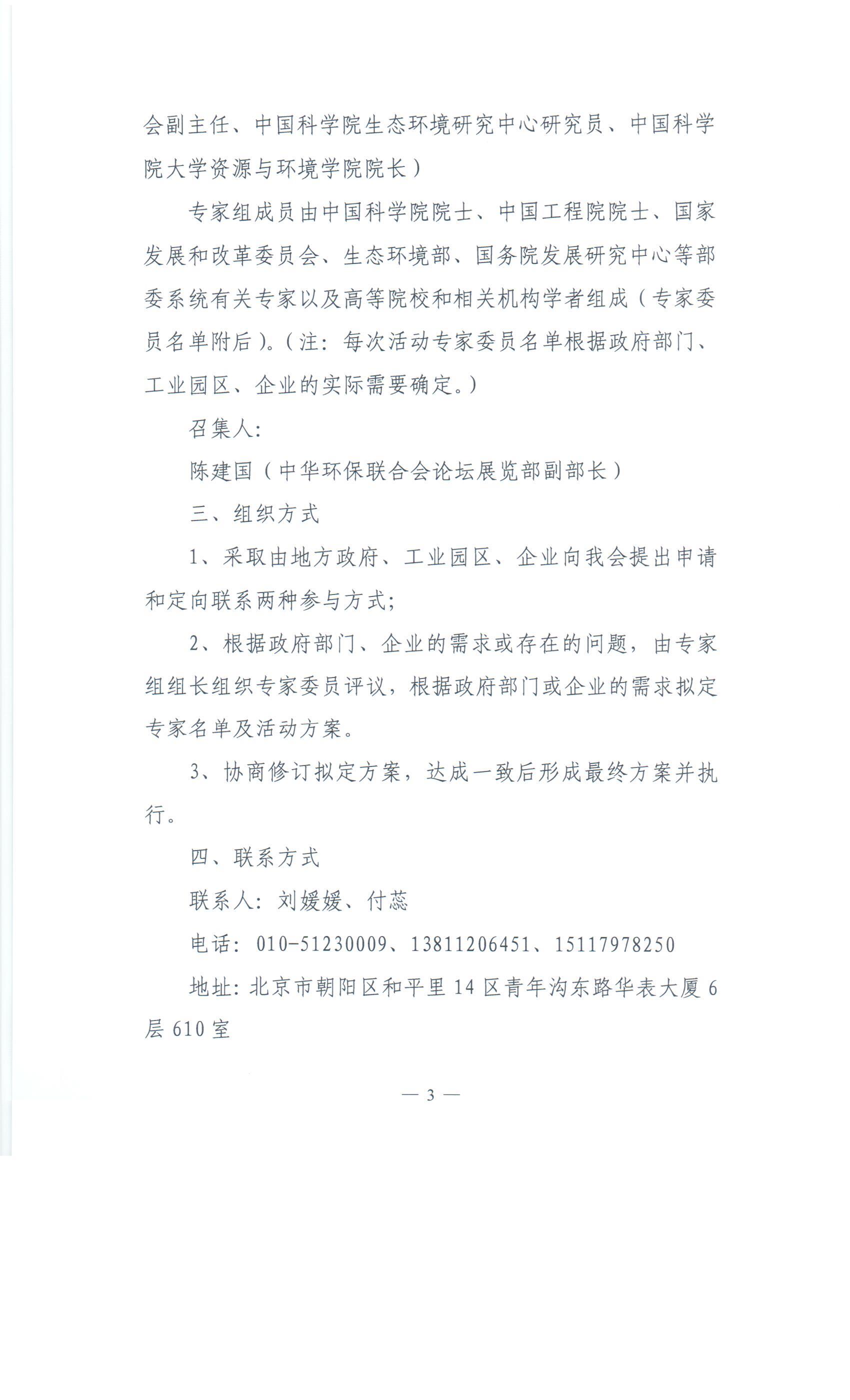 中华环保联合会将该活动作为一项长期服务地方政府有关部门、服务企业的品牌工作。活动由现场调研(环境诊断与风险排查)、座谈会、院士专家报告会、调研报告、“把脉开方”等部分组成,通过由院士、专家委员组成专家组现场调查、研究分析,从政府部门关注的水、大气、固体废物、土壤等污染防治、生态保护以及“碳达峰、碳中和”等方面,结合政策规划、技术标准,为政府部门、工业园区、企业关切的环境污染防治、环境风险与绿色发展瓶颈等问题提供理论和技术指导,提供建议方案或意见。同时,针对当前环境政策形势、打好污染防治攻坚战、“碳达峰、碳中和”等热点问题,组织院士、专家座谈会、报告会,提高政府部门、工业园区、企业生态文明建设和生态环境保护管理、决策和行动能力。活动具体通知如下文。