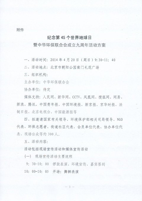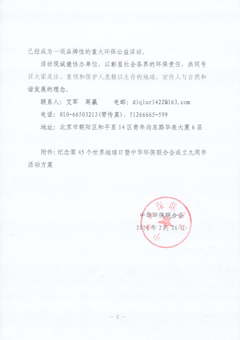 中华环保联合会关于诚邀协办“纪念第45个世界地球日暨中华环保联合会成立九周年活动”的函